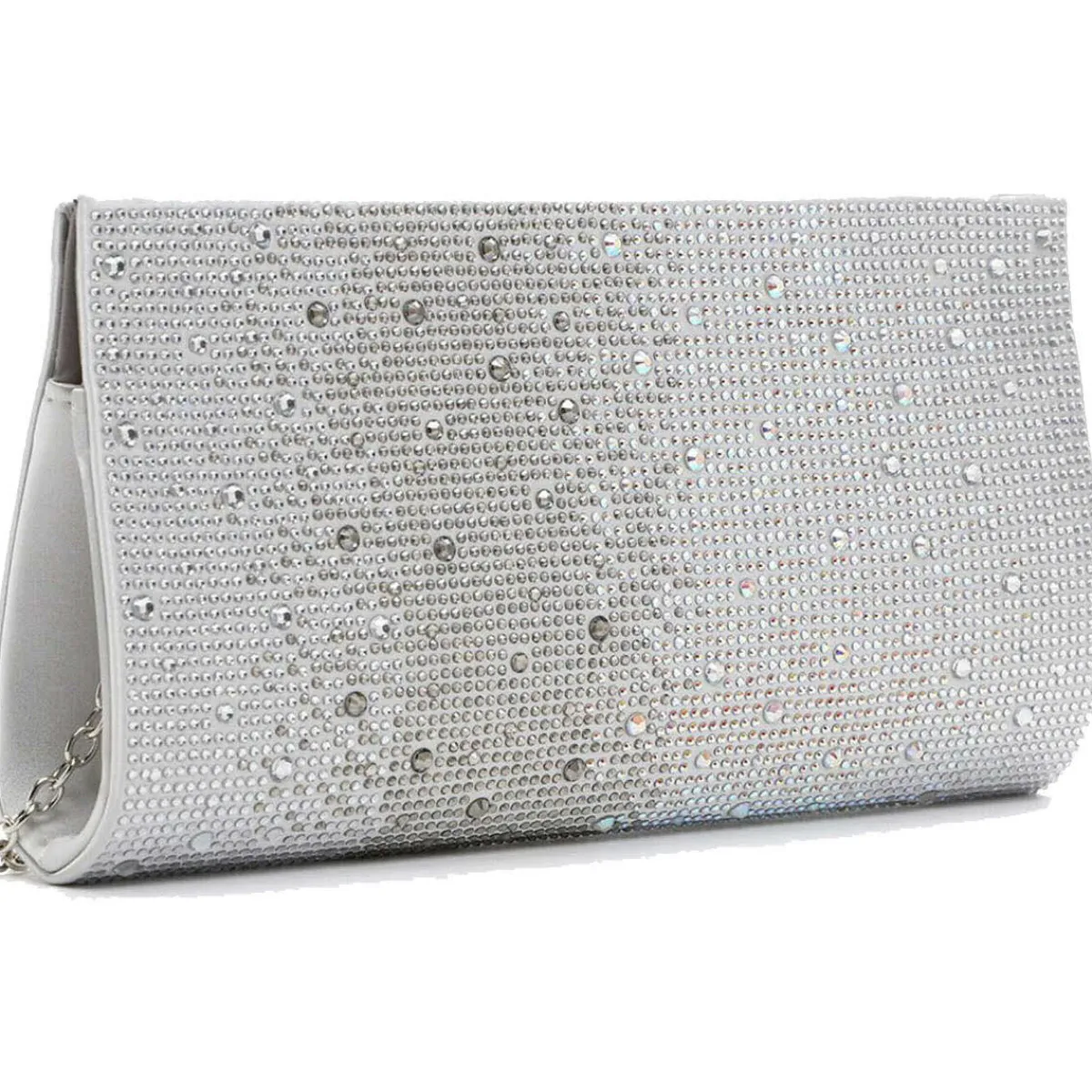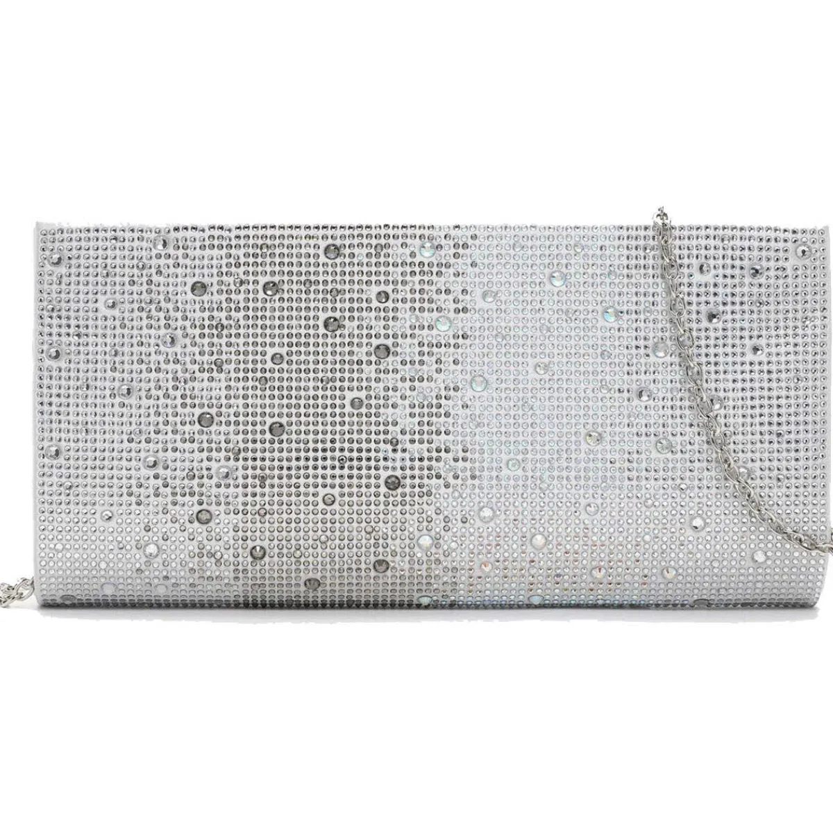 Das hochwertige und anschmiegsame Obermaterial aus Polyester ist mit großen und kleinen Stasssteinen besetzt die dezent farbig schillern. Durch die stilvolle und abnehmbare Kette kann die Damen Handtasche auch über der Schulter getragen werden. In dem kleinen Hauptfach findet das Notwendigste für den Abend Platz.