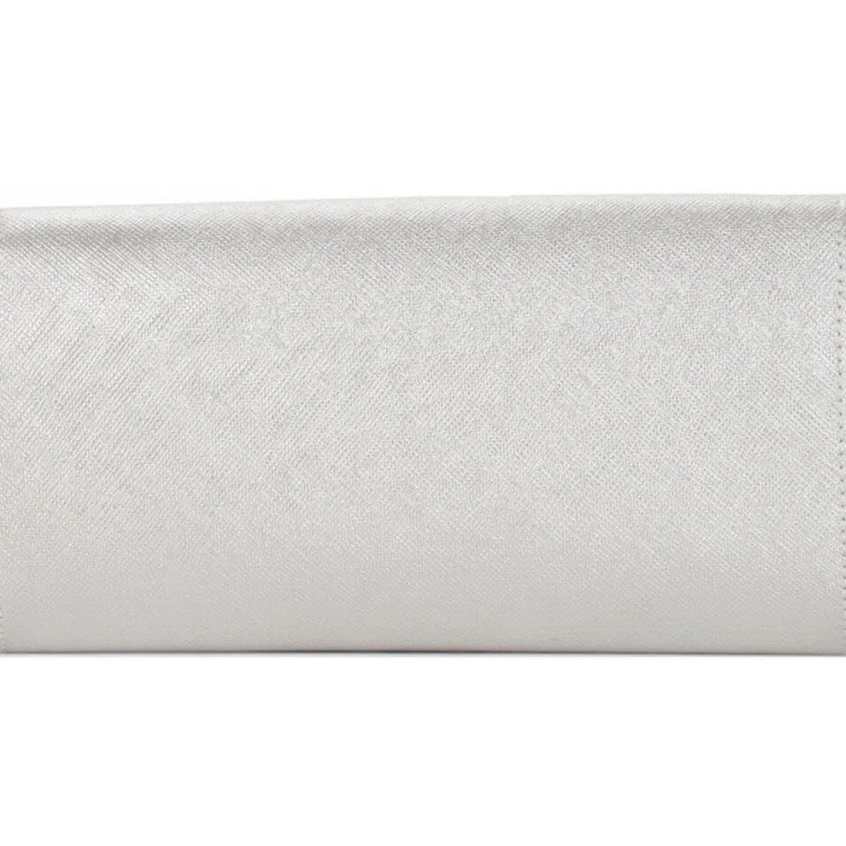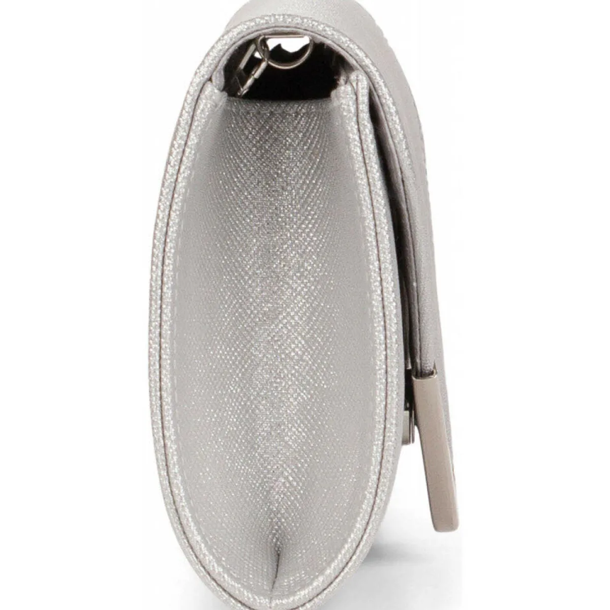 Das hochwertige und anschmiegsame Obermaterial aus Kunstleder schillert in metallic Silber und gibt der Abendtasche noch den letzten Schliff. Durch die stilvolle und abnehmbare Kette kann die Damen Handtasche auch über der Schulter getragen werden. In dem kleinen Hauptfach findet das Notwendigste für den Abend Platz.