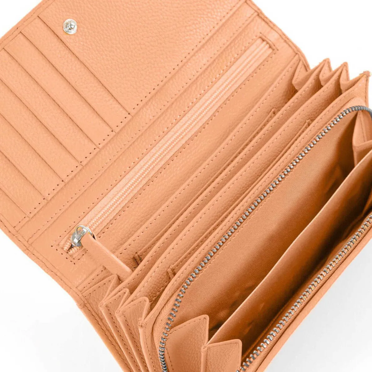 Das Portemonnaie wurde aus Kunstleder gefertigt und lässt sich durch einen Druckknopf öffnen und schließen. Das Innenleben besteht aus großen Fächern für Geldscheine und zahlreichen kleinen Fächern für Karten und Ähnliches. Für Kleingeld verfügt die Langbörse über ein separates Fach mit Reißverschluss. Auf der Rückseite ist ein Steckfach zu finden.