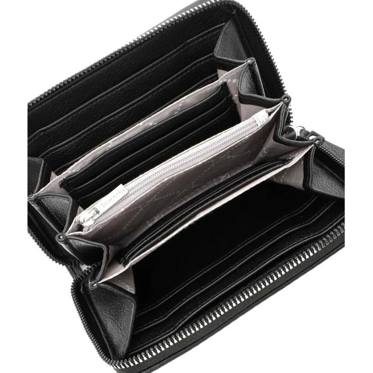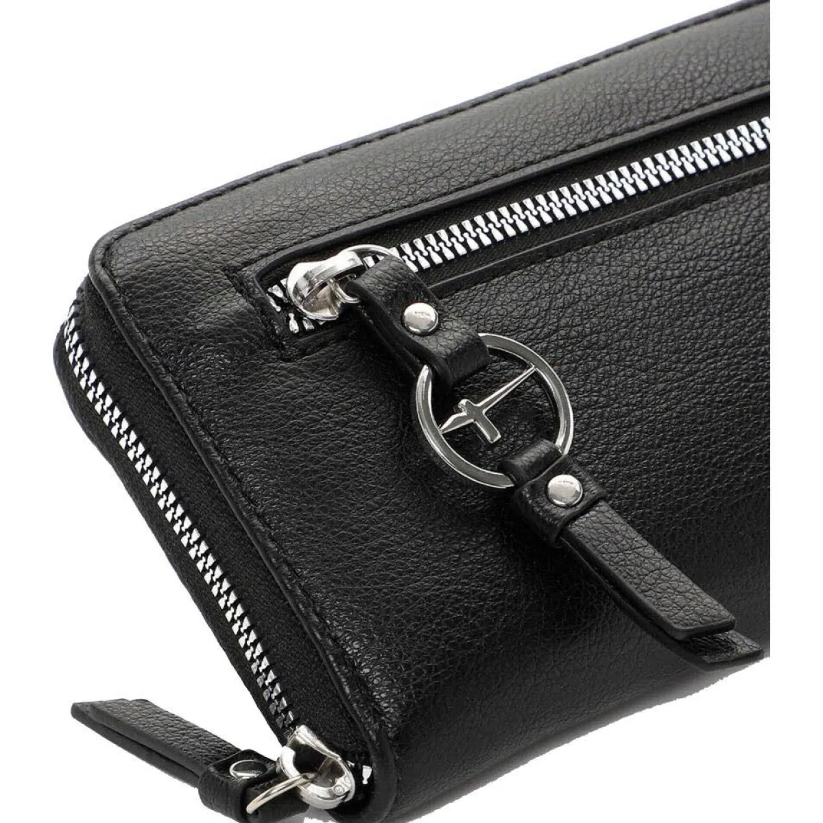 Das Portemonnaie lässt sich durch einen umlaufenden Reißverschluss öffnen und schließen. Das Innenleben besteht aus großen Fächern für Geldscheine und zahlreichen kleinen Fächern für Karten und Ähnliches. Für Kleingeld verfügt die Geldbörse über ein separates Innenfach mit Reißverschluss. An der Vorderseite befindet sich ein weiteres kleines Fach, was ebenfalls mit einem Reißverschluss geschlossen werden kann. Daran befindet sich ein toller Tamaris Anhänger.