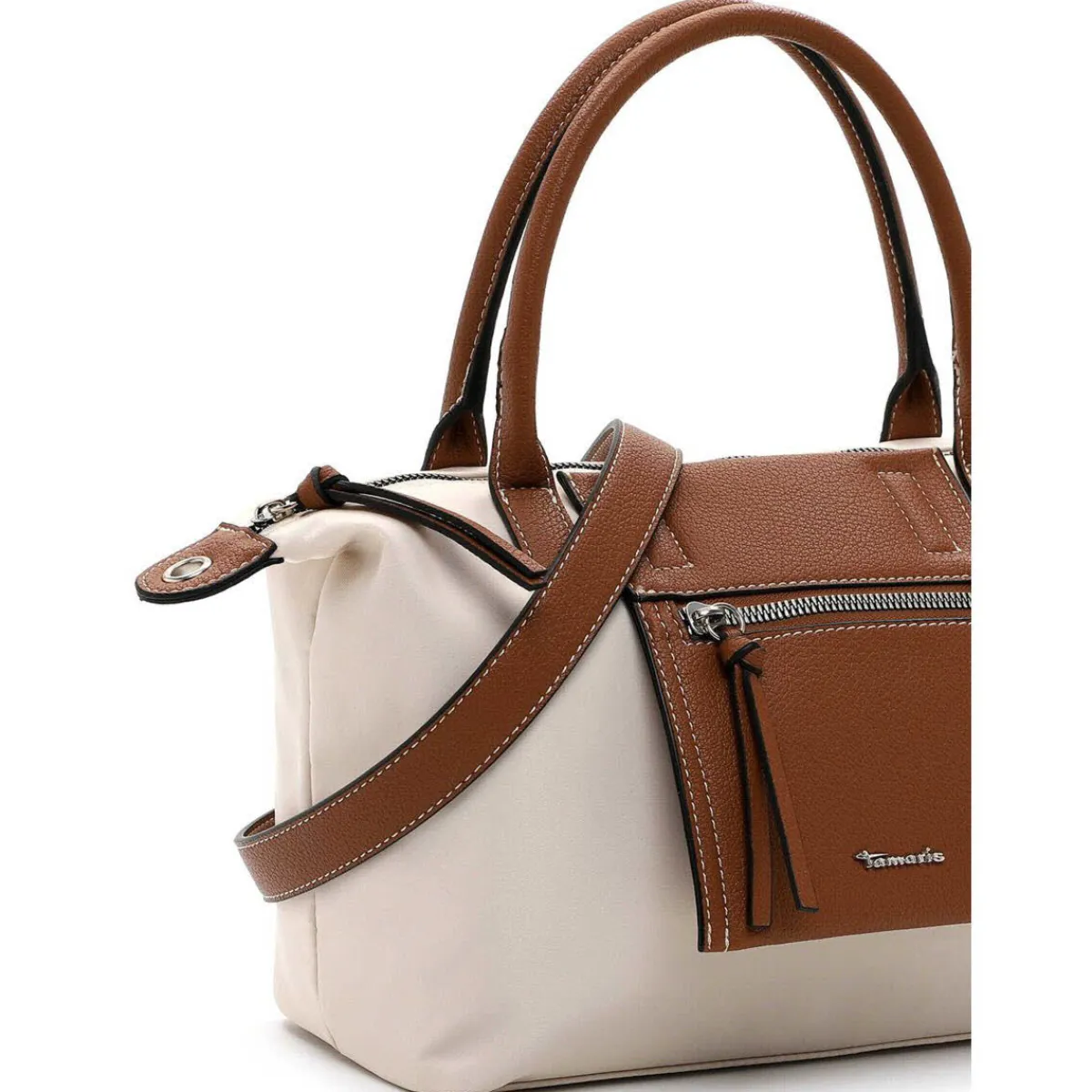 Die Handtasche wurde aus pflegeleichtem Polyester in Beige gefertigt und mit Details aus Kunstleder in Cognac Braun versehen. Die Tasche ist durch ihr stilvolles Design ein besonderer Blickfang und begleitet dich besonders edel in der Freizeit und ins Büro.