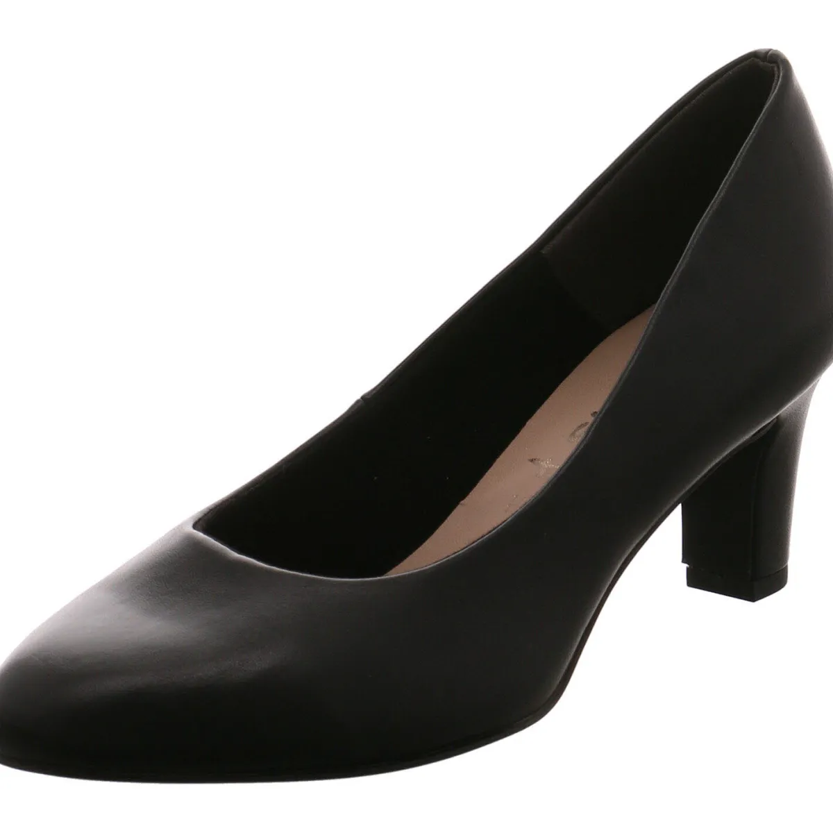 Gefertigt aus Kunstleder in Schwarz ist er mit einem Trichterabsatz in angenehmer Höhe gefertigt der lange Beine zaubert.