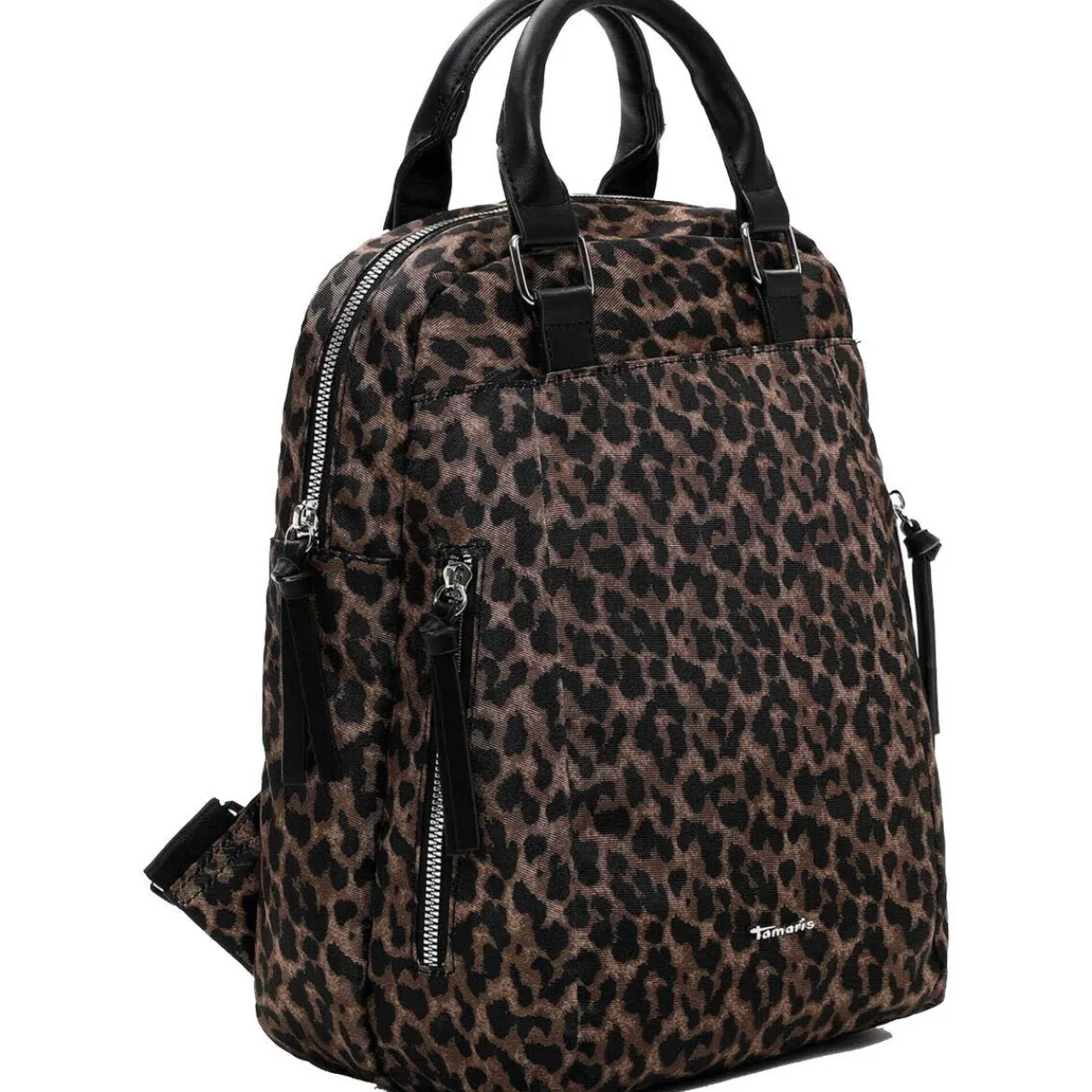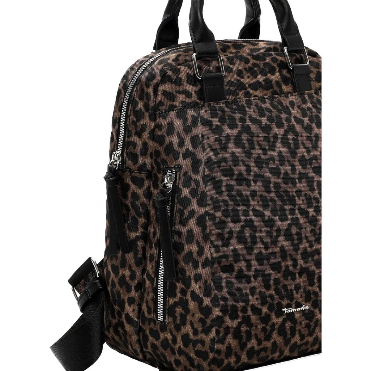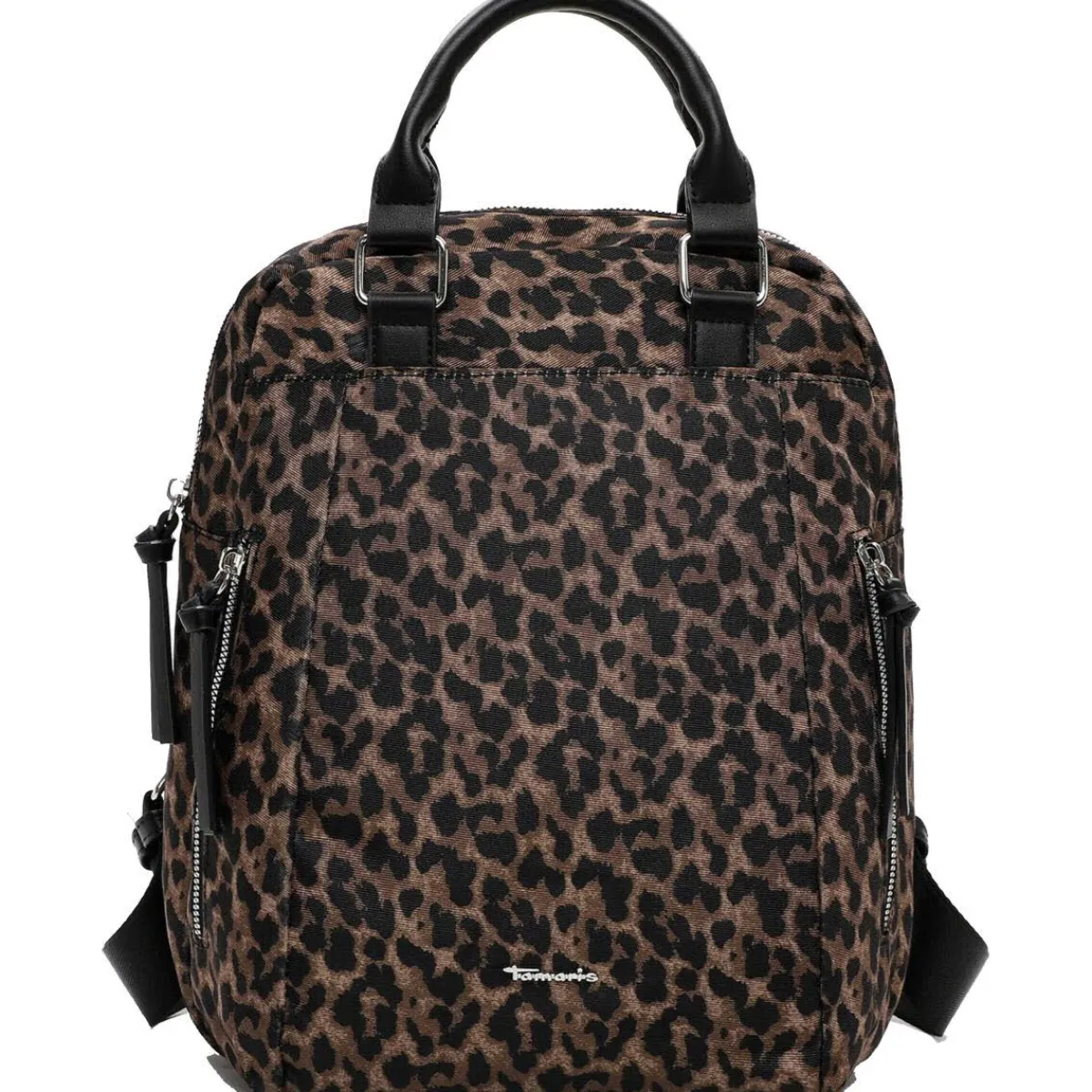 Das Obermaterial aus Polyester in Schwarz und Braun im angesagten Leo Look ist pflegeleicht und robust und macht den Rucksack zum idealen Begleiter für den Alltag.