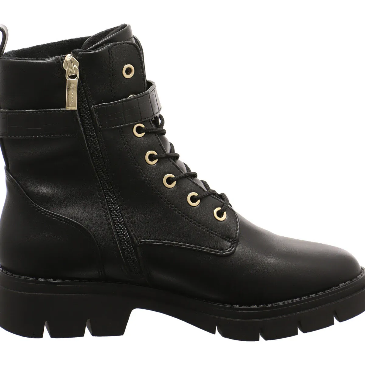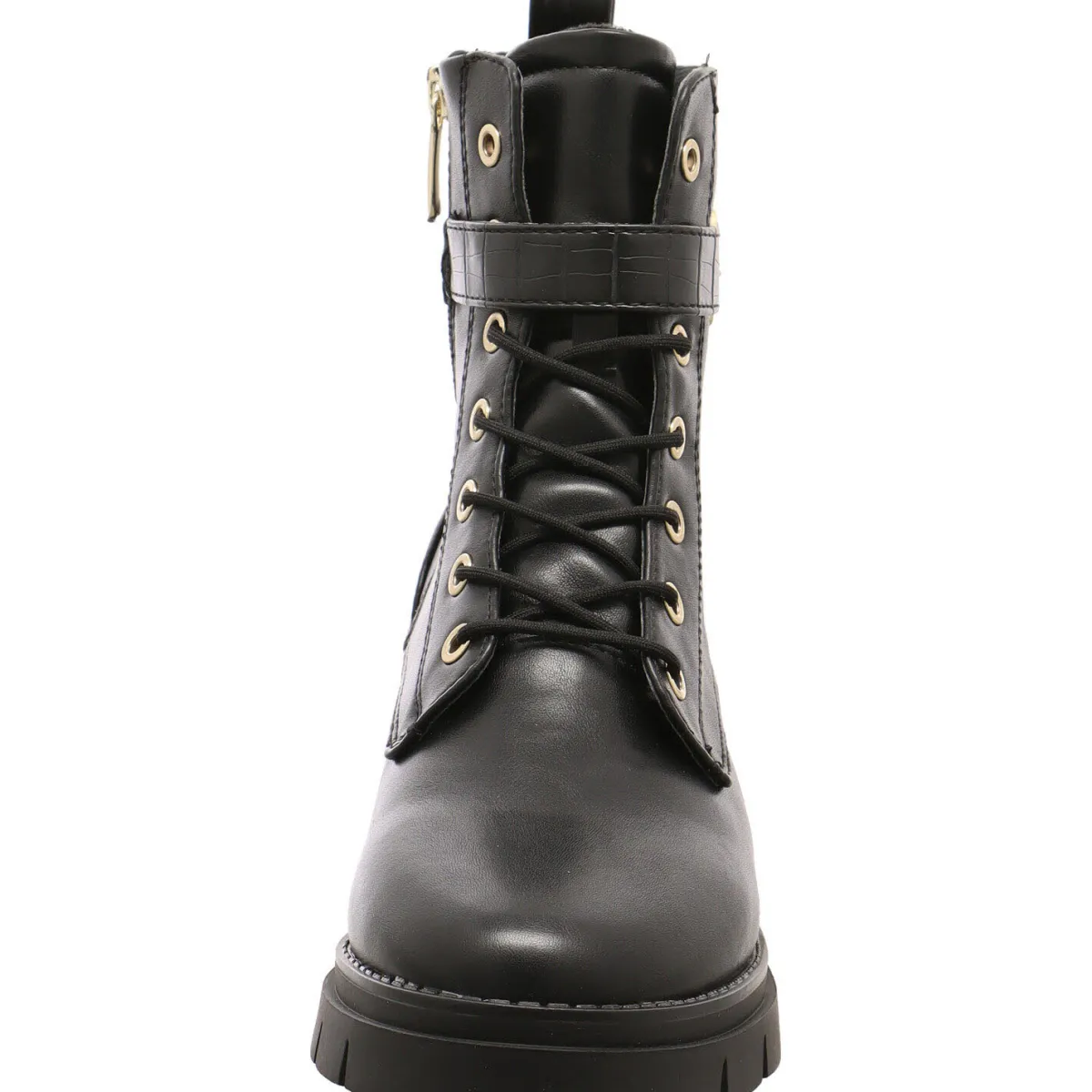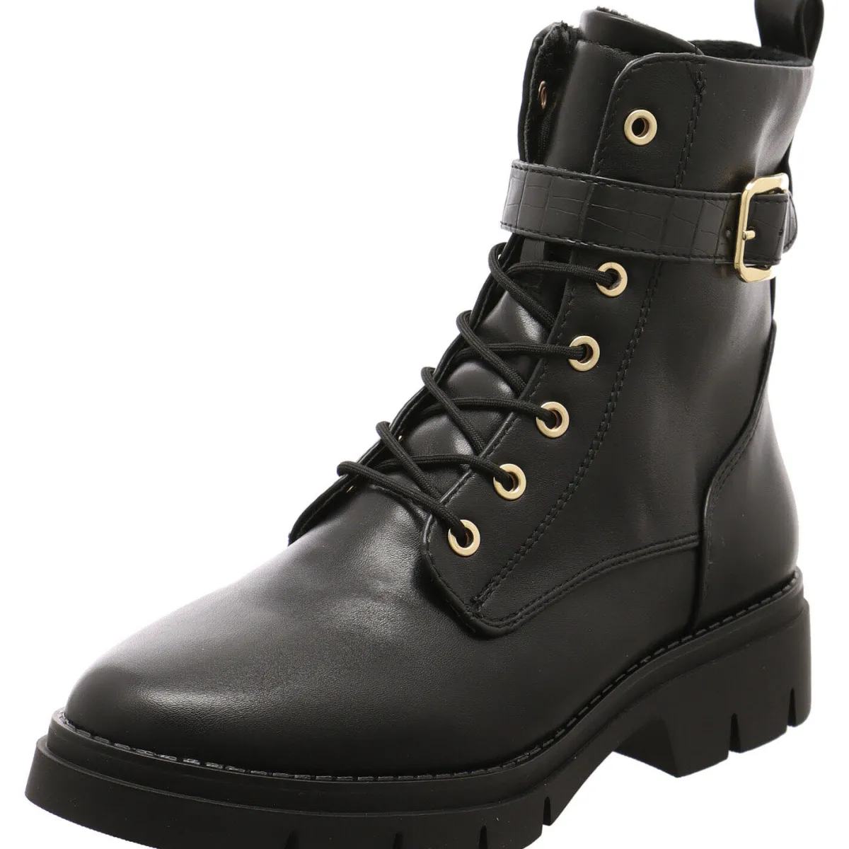 Gefertigt aus Kunstleder in Schwarz ist der Riemen um den Schaft mit einer Reptilien Prägung versehen. Die Schnürsenkel Ösen, eine Zierschnalle an der Seite und das Markenlogo, an der Rückseite vom Schaft, sind Gold abgesetzt und absolute Eyecatcher.