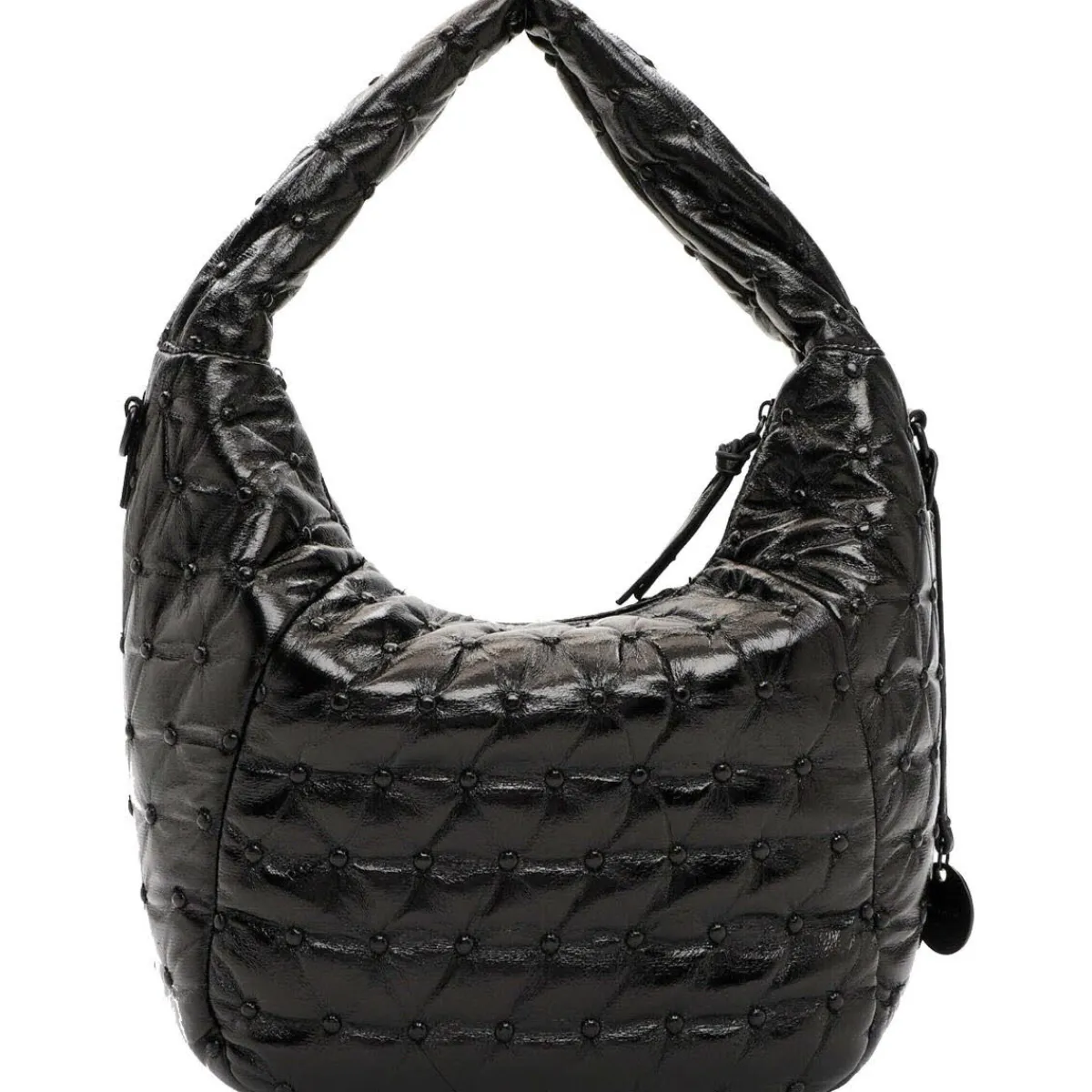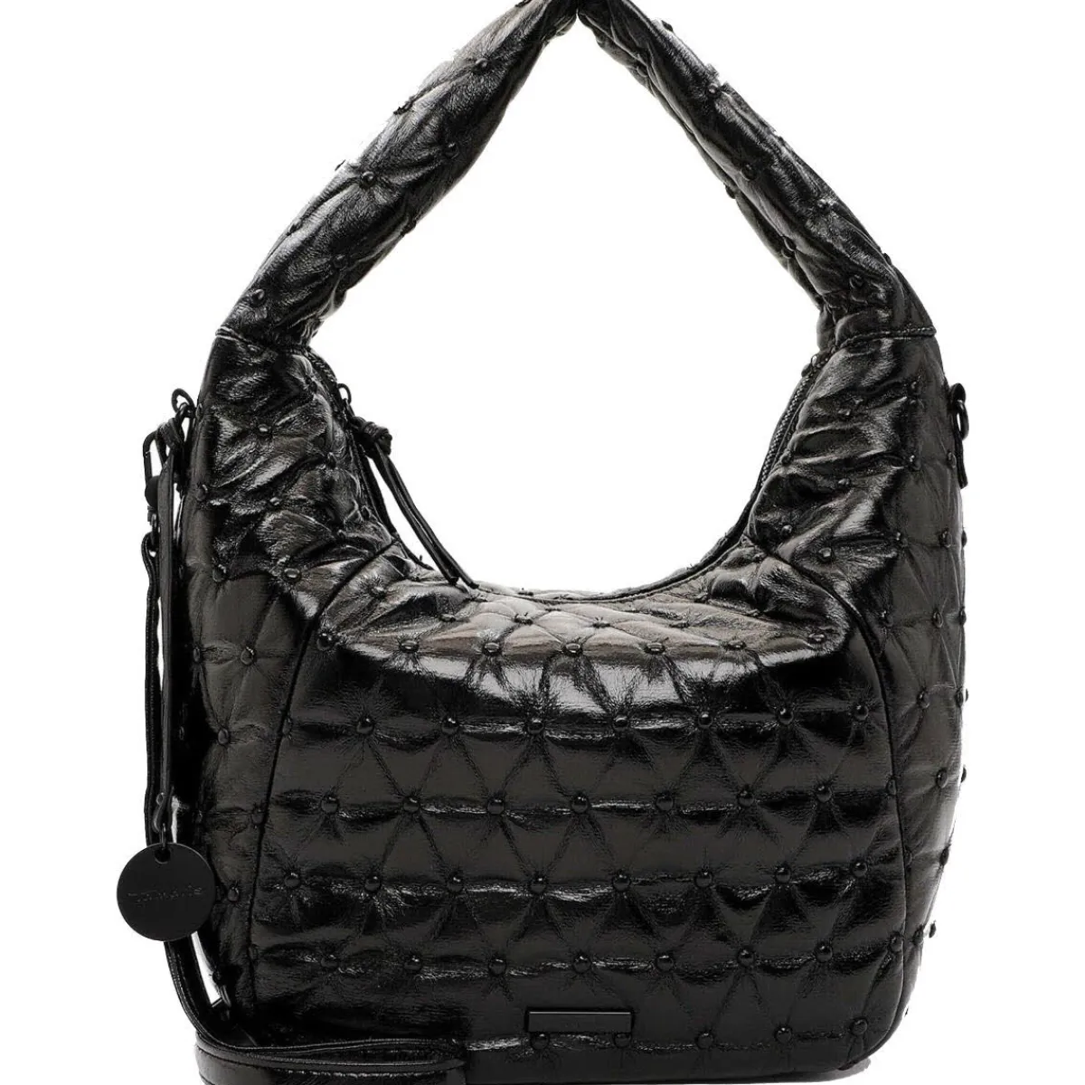 Edel verarbeitetes Kunstleder in Schwarz wurde mit einer angenehmen Haptik versehen, die der Handtasche das gewisse Etwas verleiht. Auf das Obermaterial wurden viele kleine Knöpfen angebracht, wodurch ein hübsches Steppmuster entsteht. Sie ist der ideale Begleiter für deinen Stadtbummel, denn sie verstaut übersichtlich und elegant deine liebsten Errungenschaften.