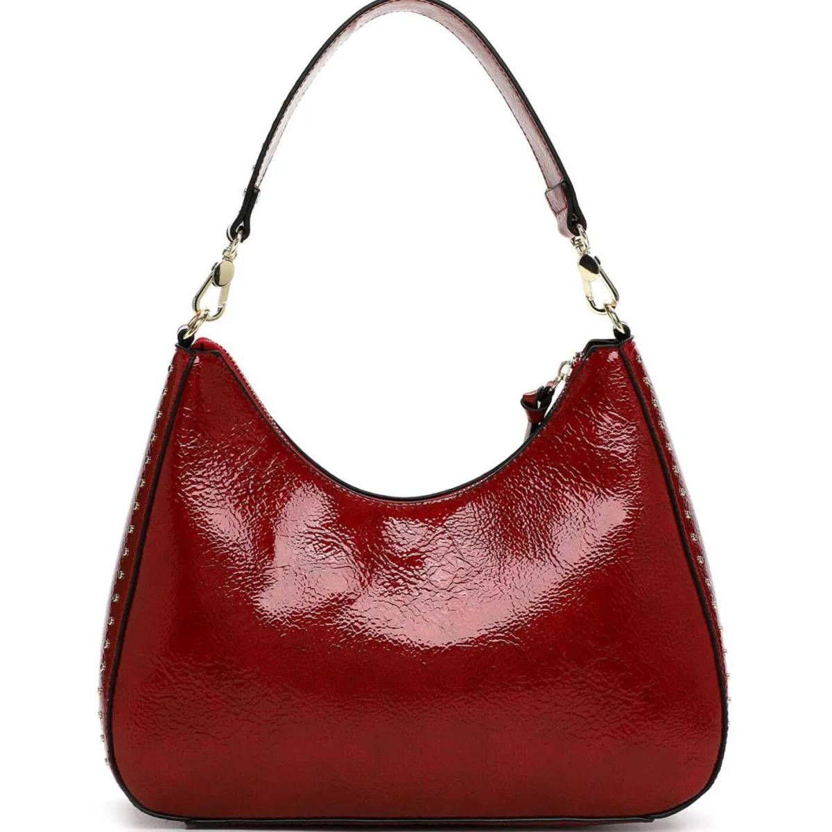 Das große Hauptfach verstaut alle Dinge, auf die du im Alltag nicht verzichten möchtest. Das glänzende Obermaterial mit Lack Finish in Verbindung mit den angesagten Nieten in Gold machen sie zum absoluten Trendsetter.