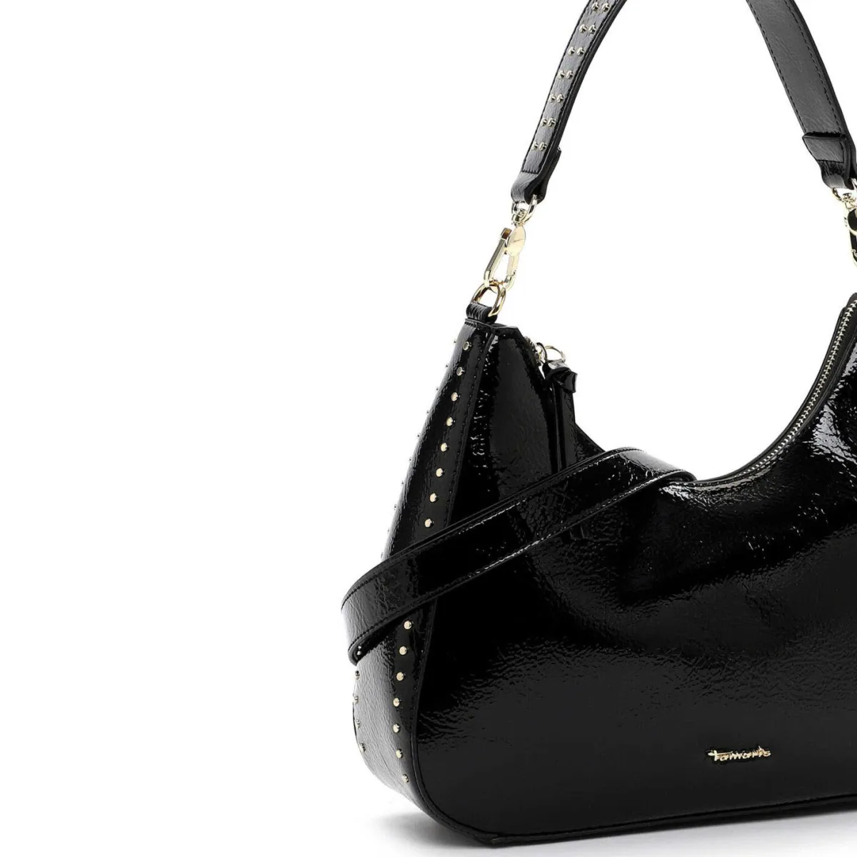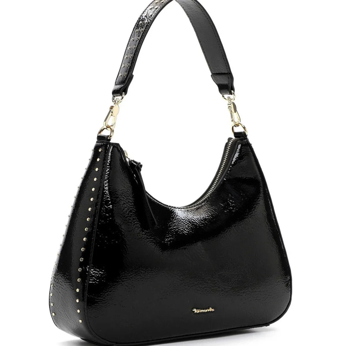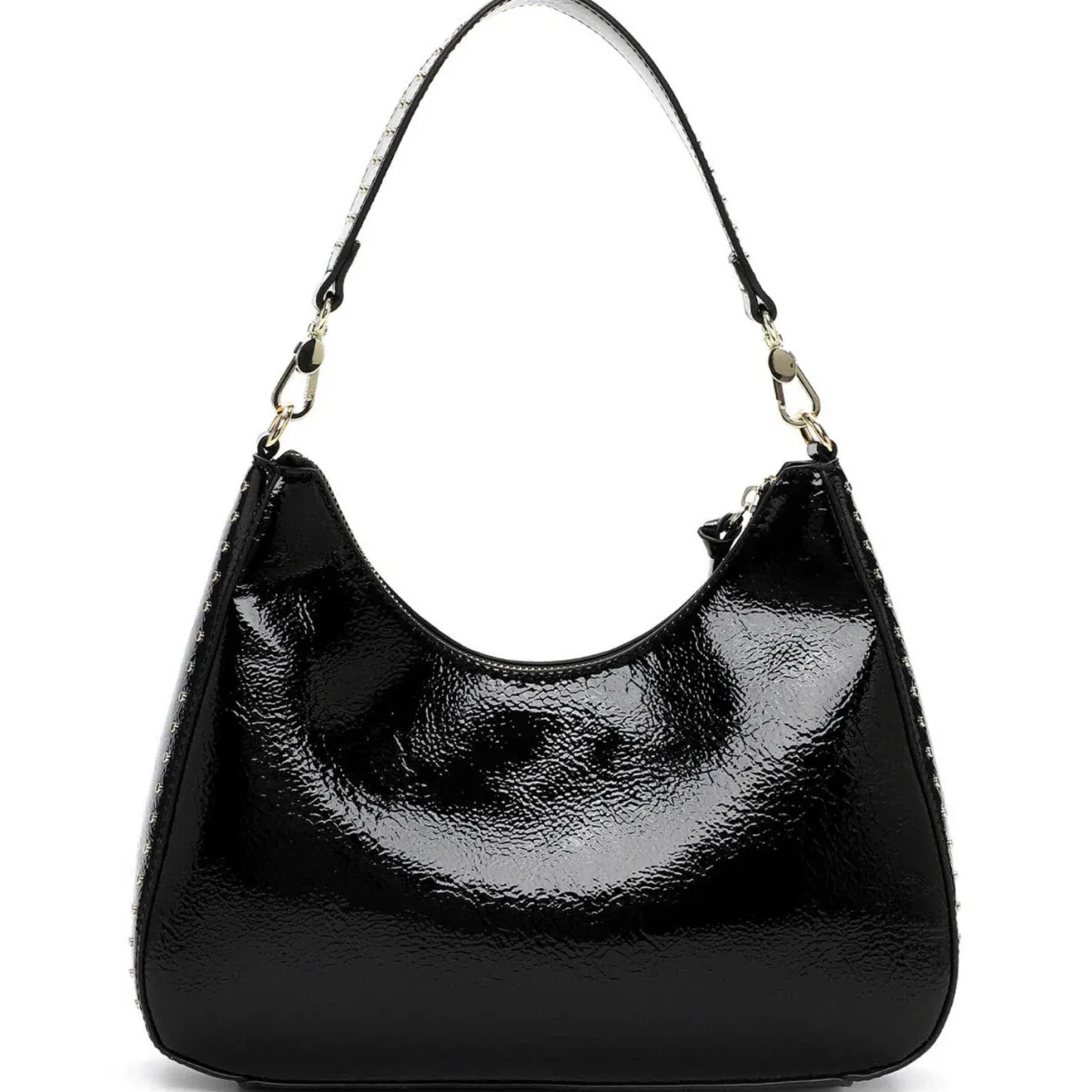 Das große Hauptfach verstaut alle Dinge, auf die du im Alltag nicht verzichten möchtest. Das glänzende Obermaterial mit Lack Finish in Verbindung mit den angesagten Nieten in Gold machen sie zum absoluten Trendsetter.