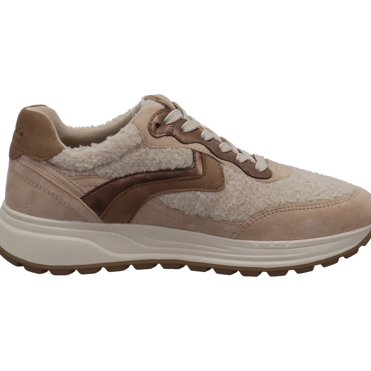 Das griffige Obermaterial aus Nubukleder in Beige Braun besticht durch tolle Details aus Teddyfell und glänzende Parts in Metallic-Optik. Die Innensohle ist als Wechselfußbett gearbeitet und besteht aus weichem Textil. Die breiten Schnürsenkel verleihen dem Schuh eine besondere Optik.