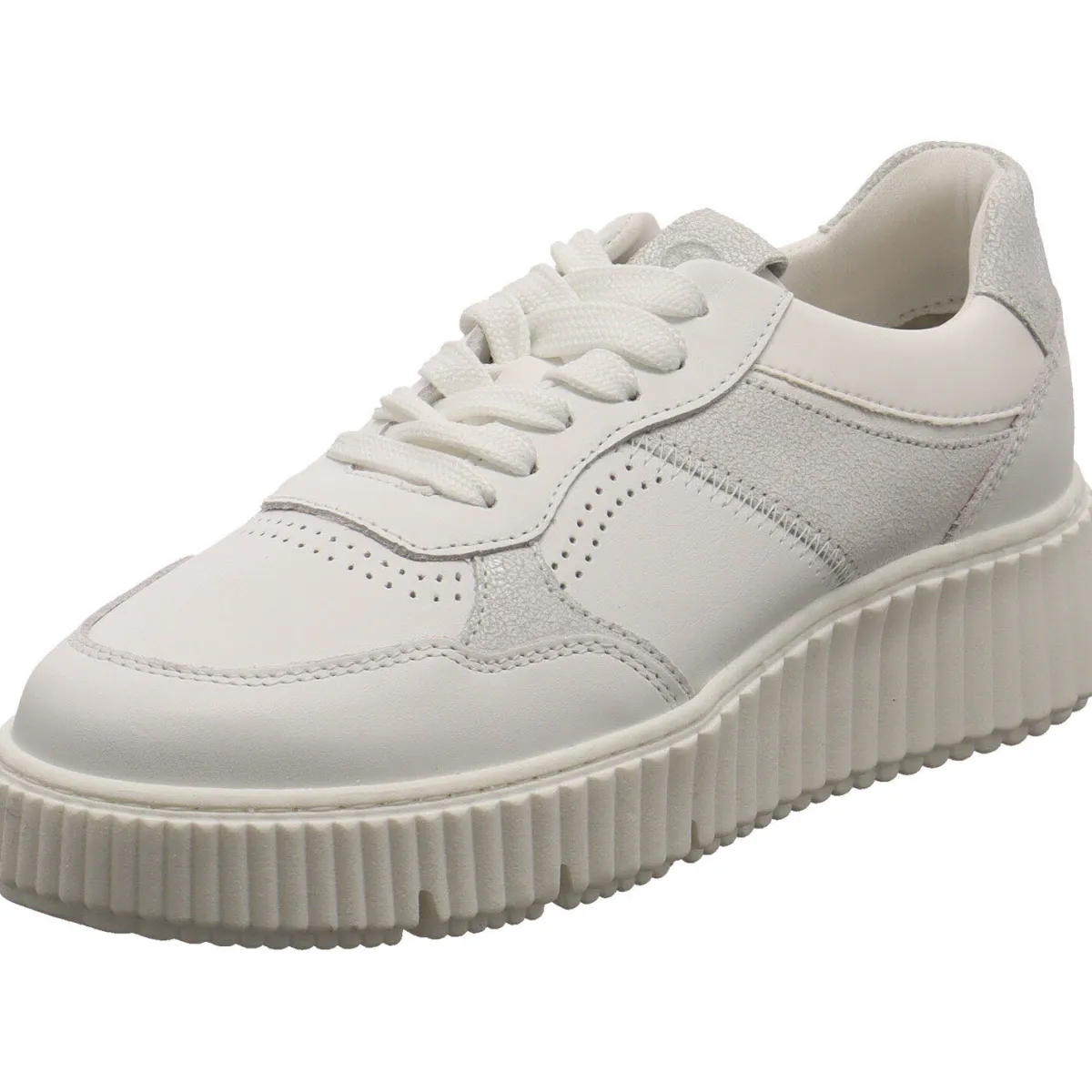 Er begeistert und durch seine tolle Ovleray Optik mit verschiedenen Haptiken und Farbnuancen, aus eine Mix aus Echtleder und Synthetik in Weiß und Grau.