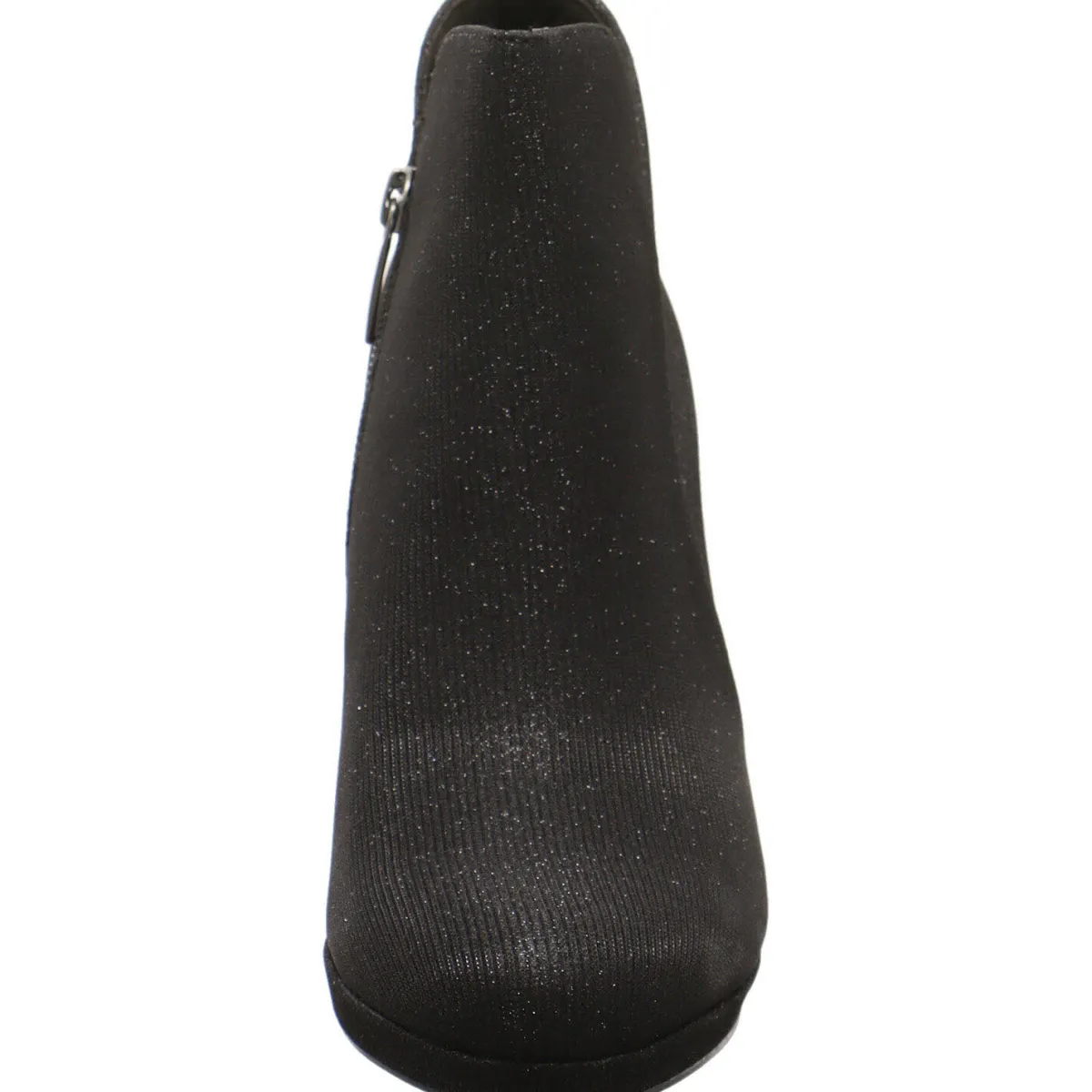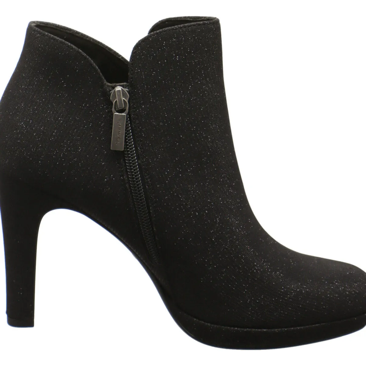 Die Ankle Boots wurden aus Textil in Schwarz mit Glitzer gefertigt und fallen besonders durch den schmalen, 10 cm hohen, Trichterabsatz ins Auge.