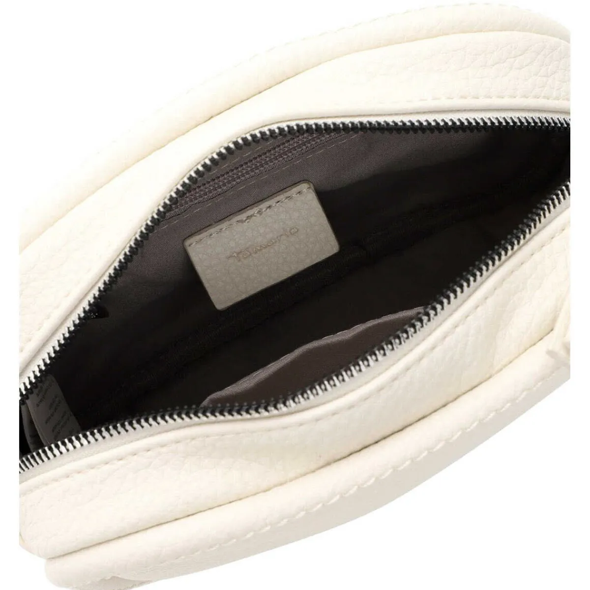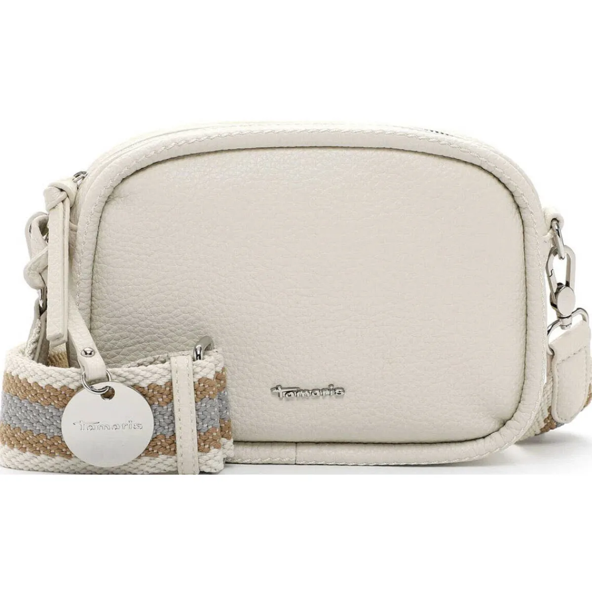 Edel verarbeitetes Kunstleder in Ecru Beige wurde mit einer angenehmen Haptik versehen, die der Handtasche das gewisse Etwas verleiht. Durch den verstellbaren und abnehmbaren Umhängegurt in Web-Optik in Braun und Blau kannst du die Tasche auch crossover tragen.