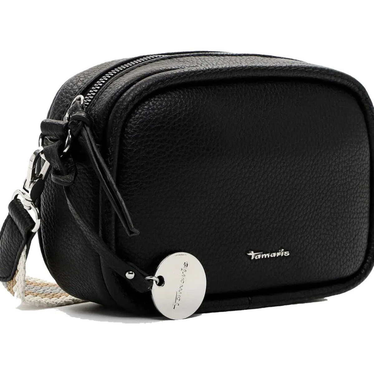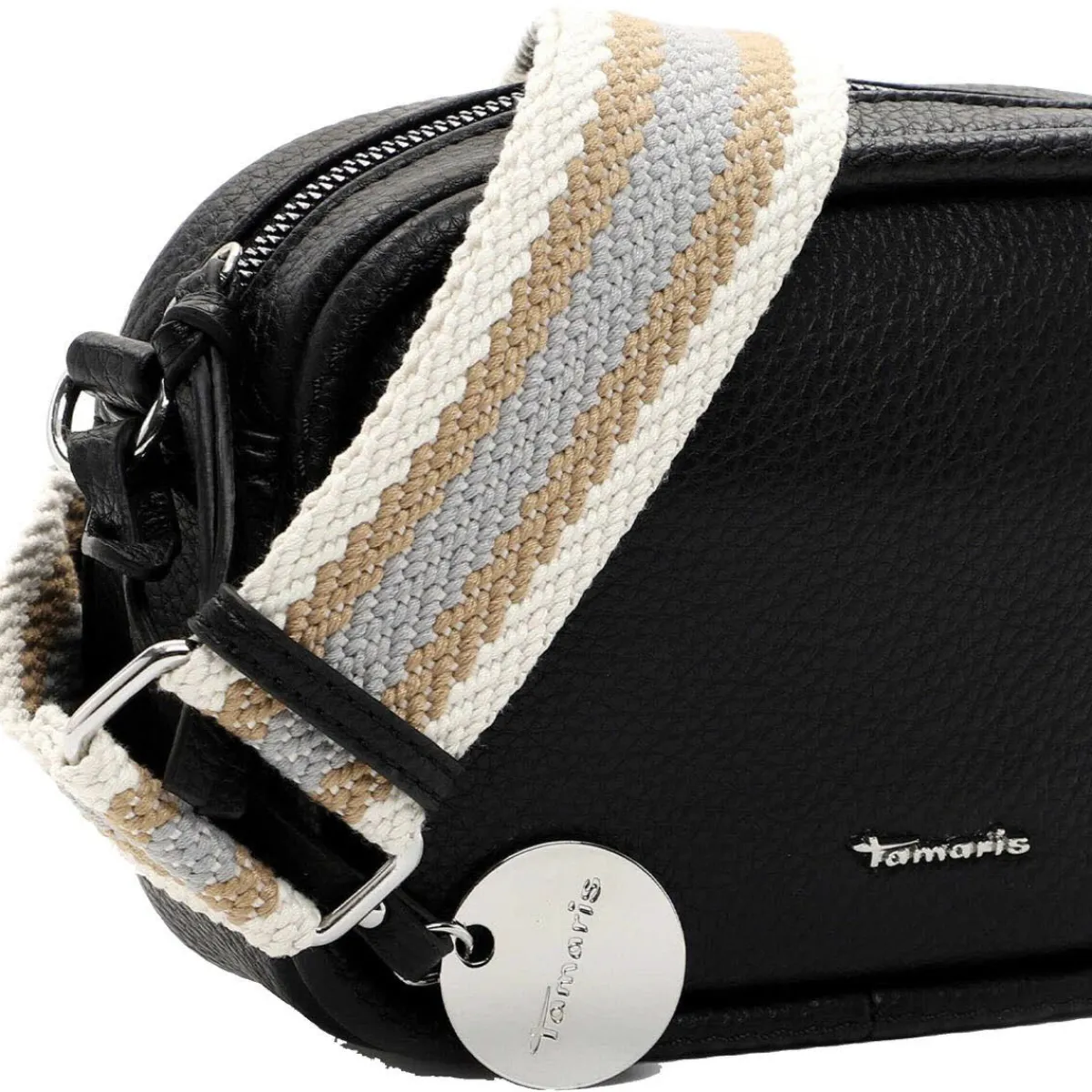 Edel verarbeitetes Kunstleder in Schwarz wurde mit einer angenehmen Haptik versehen, die der Handtasche das gewisse Etwas verleiht. Durch den verstellbaren und abnehmbaren Umhängegurt in Web-Optik in Braun und Blau kannst du die Tasche auch crossover tragen.