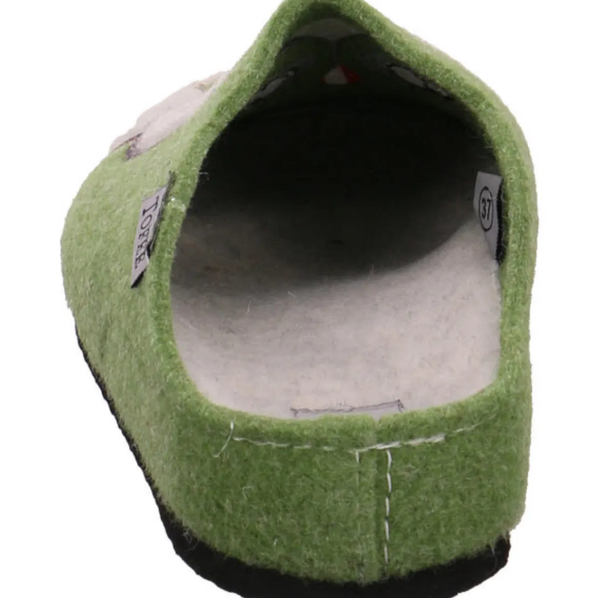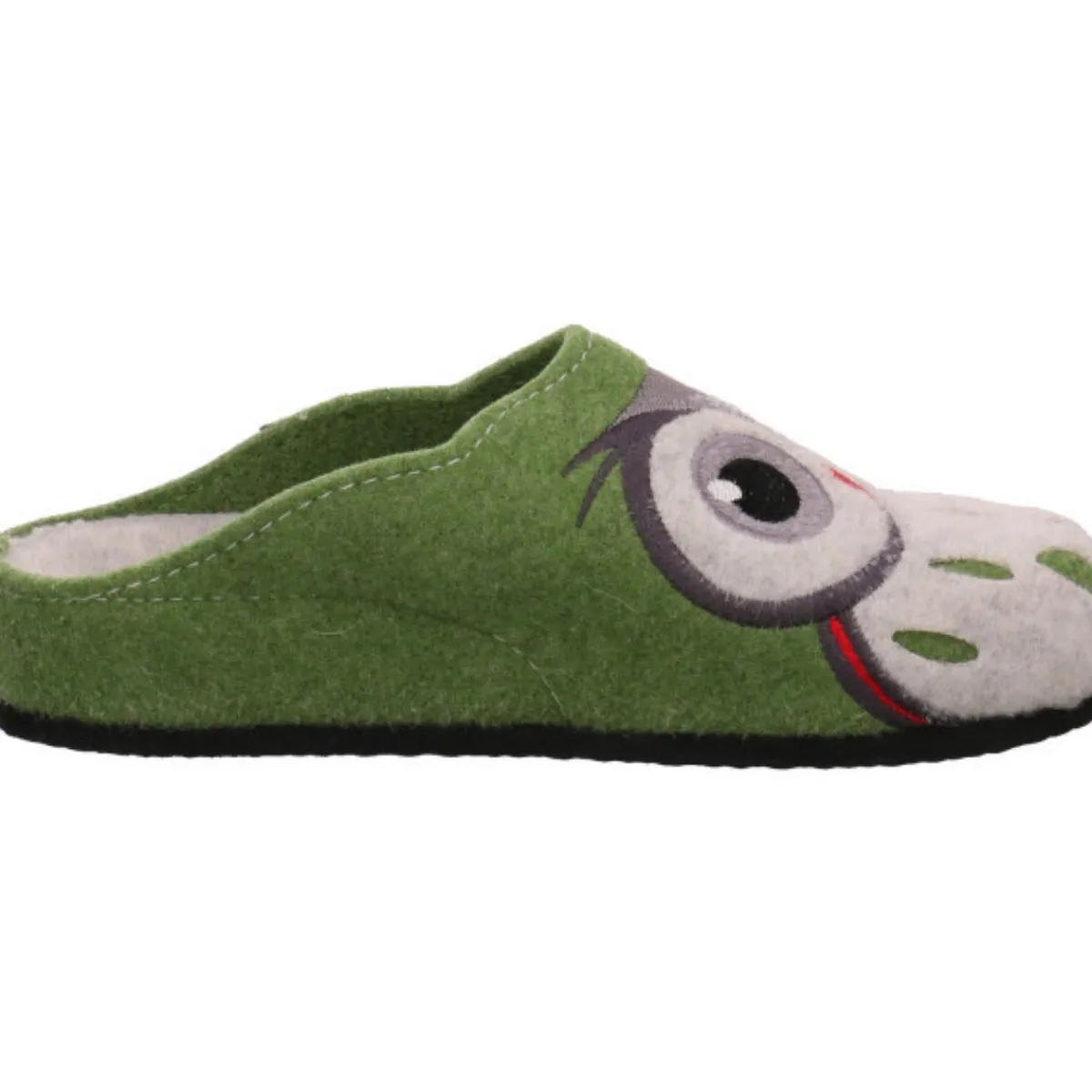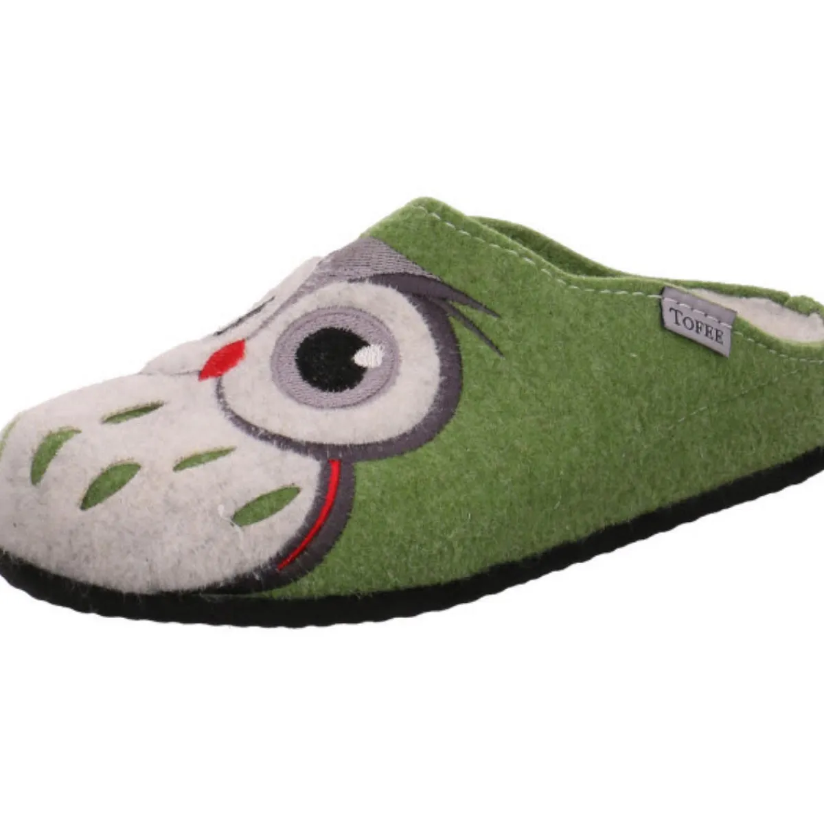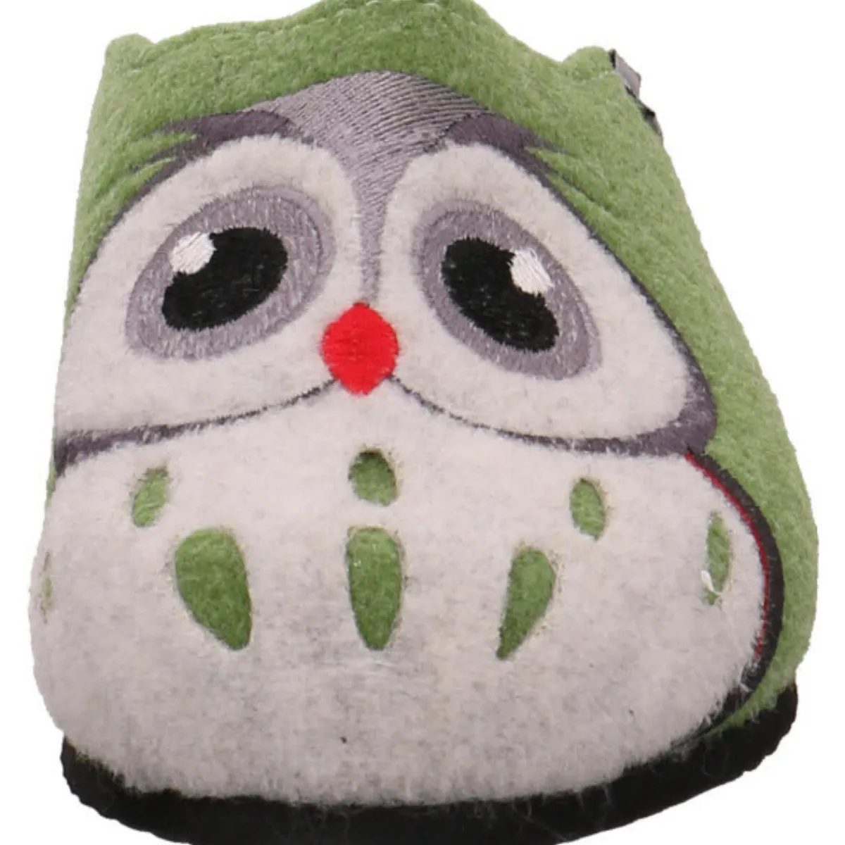 Als Eyecatcher auf dem robusten und langlebigen Obermaterial aus Filz in grün dient die gestickte Eule, die dem Schuh das gewisse Etwas verleiht.
