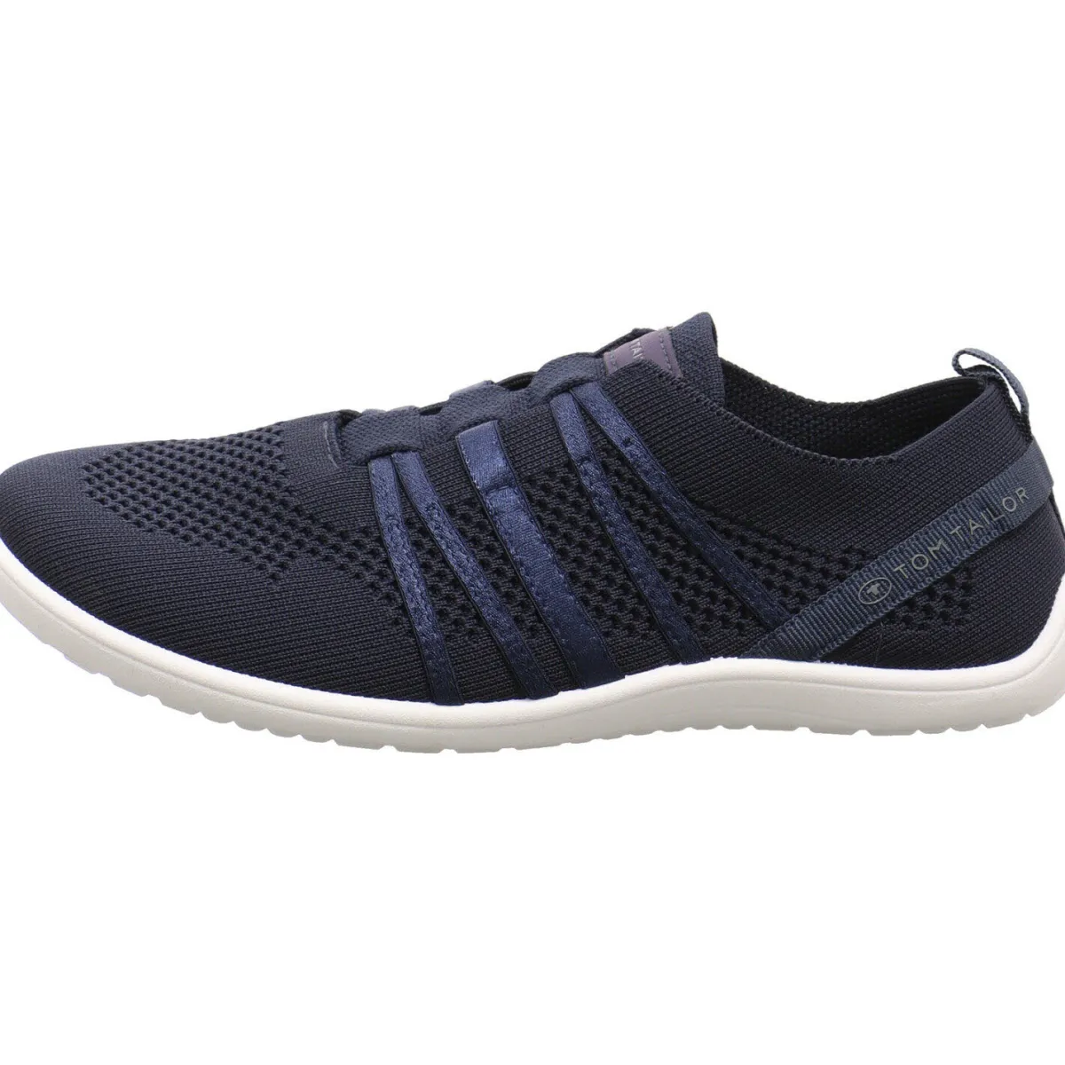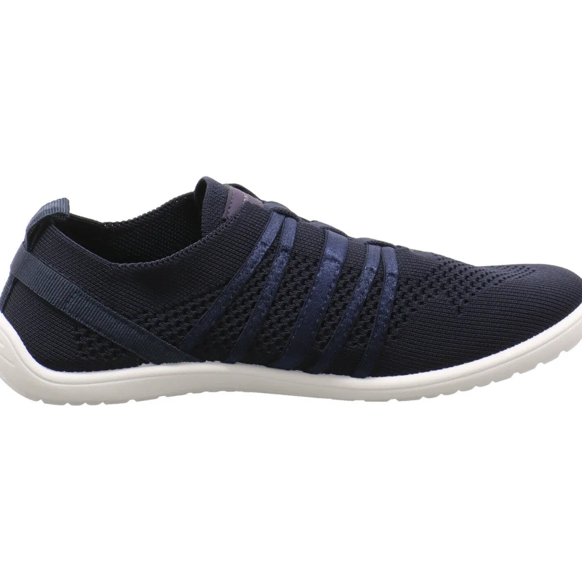 Das Obermaterial aus flexiblem Textil Mesh in Navy Blau ist ein echter Hingucker. Die stabilisierenden Gummibänder ahmen eine Schnürung nach und helfen, zusammen mit der Lasche am Schaft bei einem leichten Einstieg. Die dünne Laufsohle in Weiß, hat einen leichten Grip und die Innensohle ist herausnehmbar, was ein tolles Barfußgefühl garantiert.