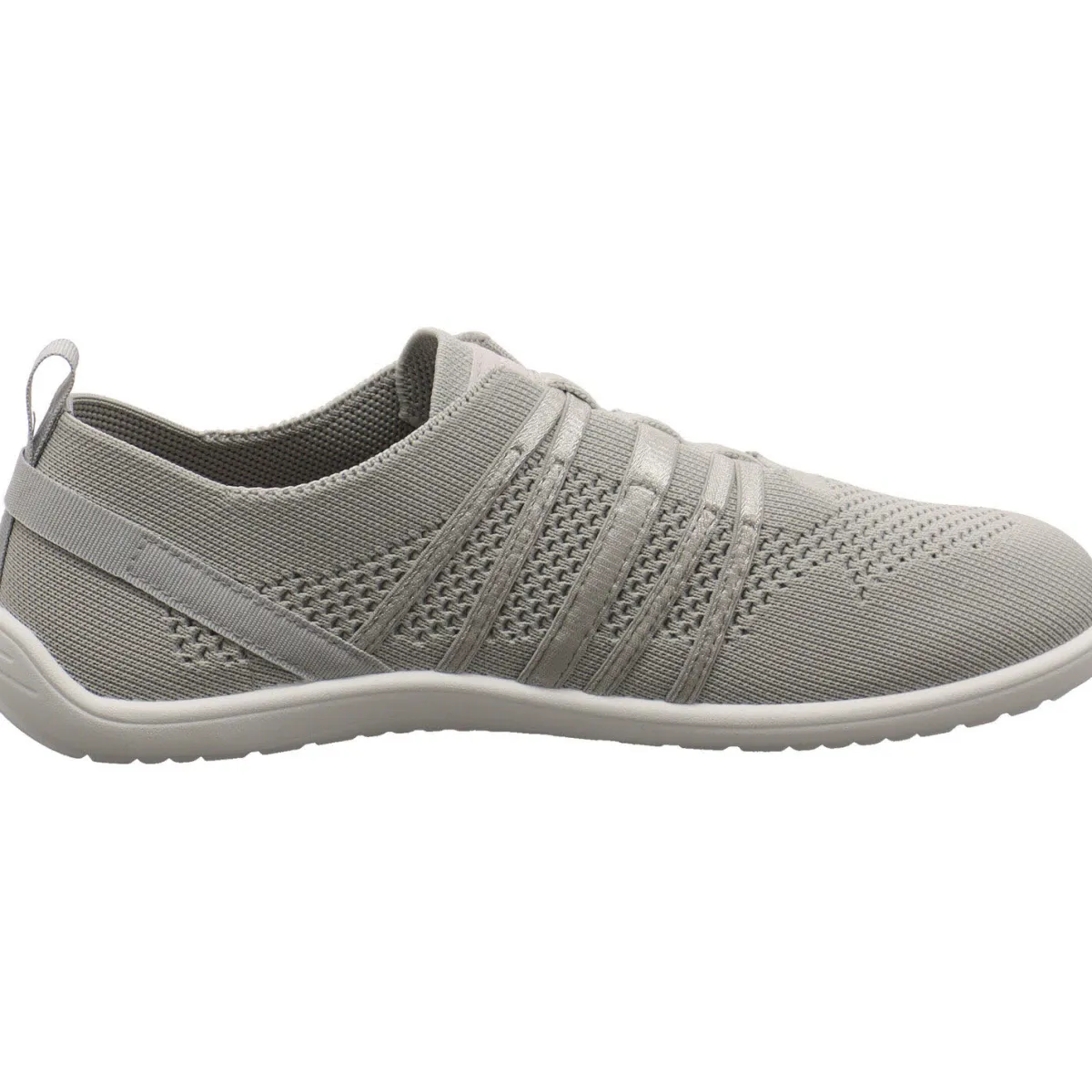 Das Obermaterial aus flexiblem Textil Mesh in Grau ist ein echter Hingucker. Die stabilisierenden Gummibänder ahmen eine Schnürung nach und helfen, zusammen mit der Lasche am Schaft bei einem leichten Einstieg. Die dünne Laufsohle in Weiß, hat einen leichten Grip und die Innensohle ist herausnehmbar, was ein tolles Barfußgefühl garantiert.