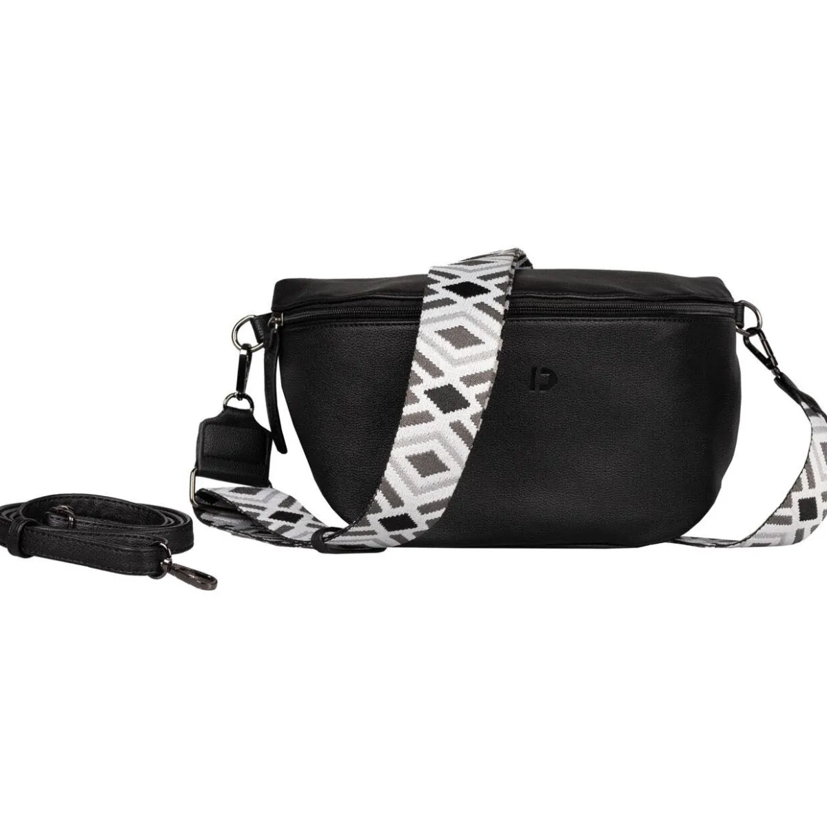 Gefertigt aus authentisch genarbtem Kunstleder in Schwarz macht sie zu jedem Outfit eine ausgesprochen gute Figur. Durch ihr praktisches Format kann die Tasche auch prima als Alltagsbegleiter verwendet werden. Absolutes Highlight und besonders modern ist der Umhängegurt mit dem grafischem Muster in Schwarz Weiß.