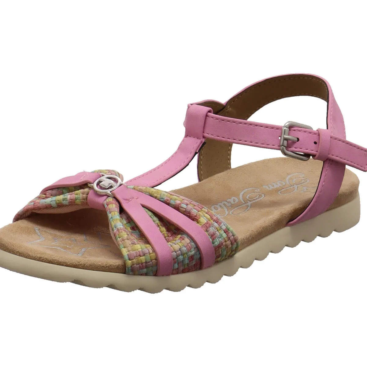 Mit dieser schönen Kinder Sandale für Mädchen von Tom Tailor ist dein Kind perfekt ausgestattet. Der Materialmix aus Textil und Kunstleder ist in einem schlichten Design in Rosa gehalten. Abgerundet wird es durch die schlichte Laufsohle in Beige und die tollen Sommer Farben auf dem Blatt.