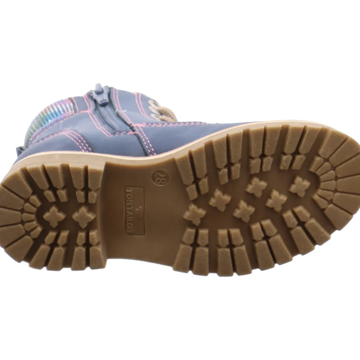 Gefertigt aus Kunstleder in Blau und mit farblich abgesetzten textilen Schaftabschluss in bunten Glitzer Streifen passt dieser Schuh perfekt zu jedem Herbstoutfit. Die Ziernähte in Rosa runden das Design des Schuhs gekonnt ab.