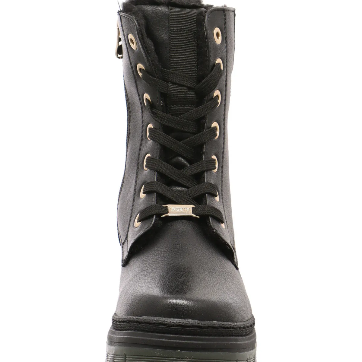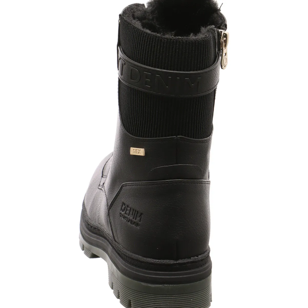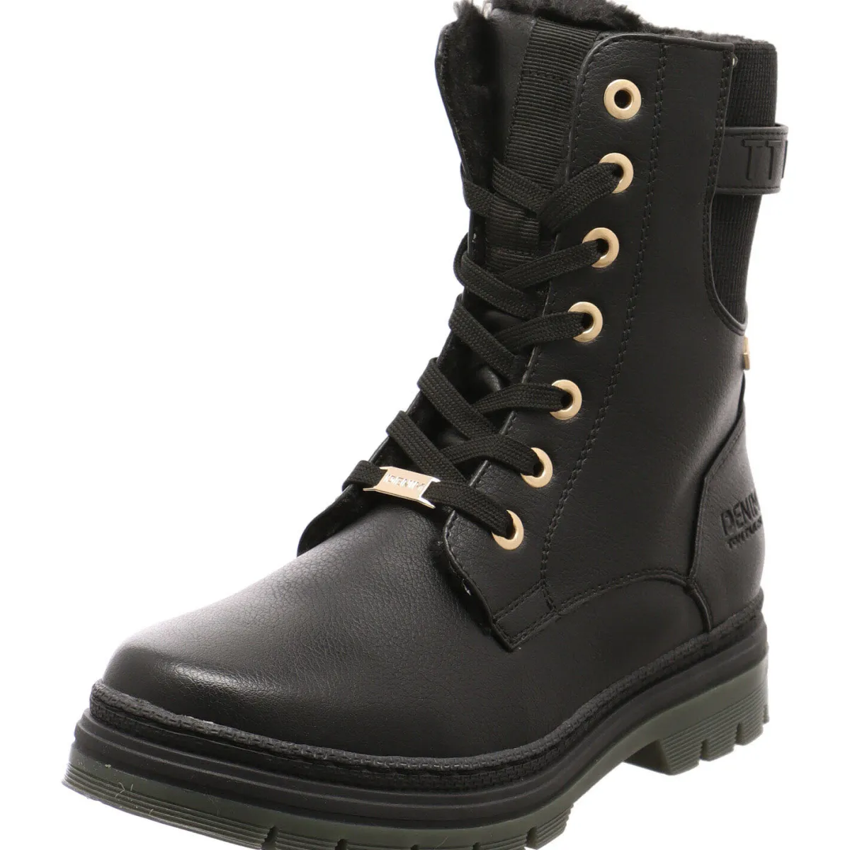 Das Obermaterial aus Kunstleder in Schwarz, ist an der Rückseite vom Schaft mit einem Textil Einsatz versehen. Darüber ist ein Riemen angebracht, auf dem das Markenlogo zu sehen ist. Durch den seitlichen Reißverschluss ist der Einstieg ganz einfach und mit der Schnürung, kann er optimal an den Fuß angepasst werden. Die Schnürsenkelösen sind Gold abgesetzt und ein direkter Eyecatcher. Das Innenfutter ist besonders flauschig und in Verbindung mit der Tex Ausstattung, die den Boots wasserabweisend macht, bleiben deine Fuße warm und trocken.