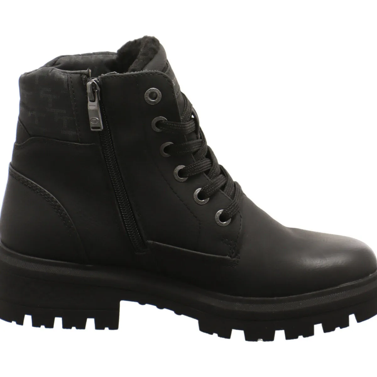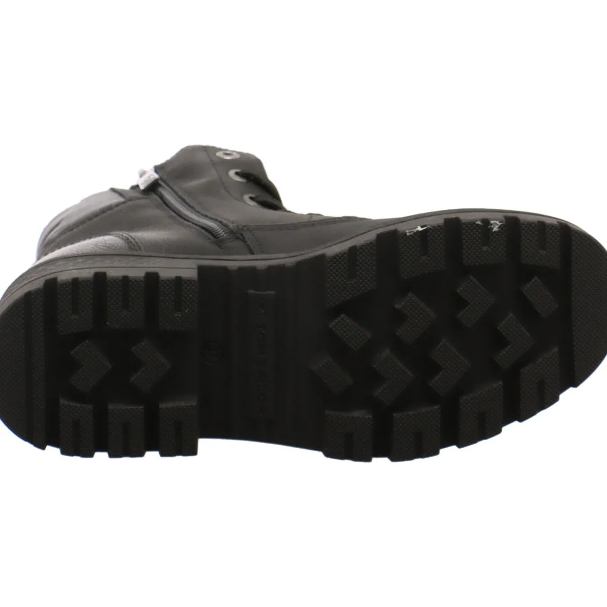 Ein besonderer Hingucker ist der textile gepolsterte Schaftrand mit angesagtem Muster. Der Blockabsatz, sowie die gut profilierte Laufsohle runden das Gesamtkonzept ab. Der Schuh besitzt einen praktischen Reißverschluss an der Innenseite und die Schnürung sorgt für eine perfekte Passform.