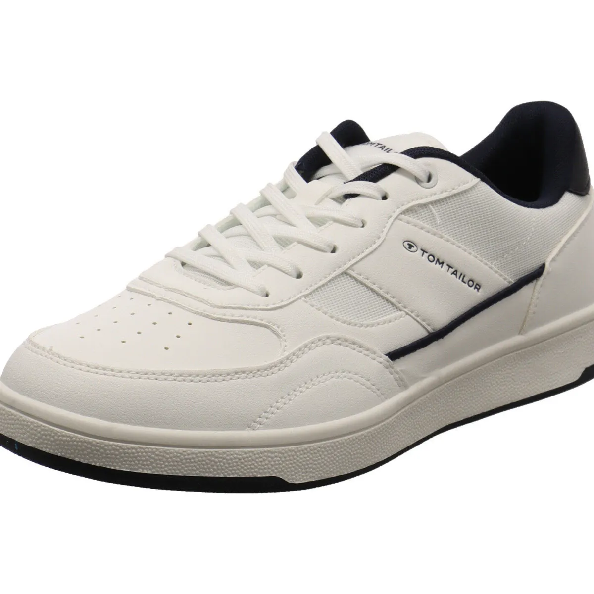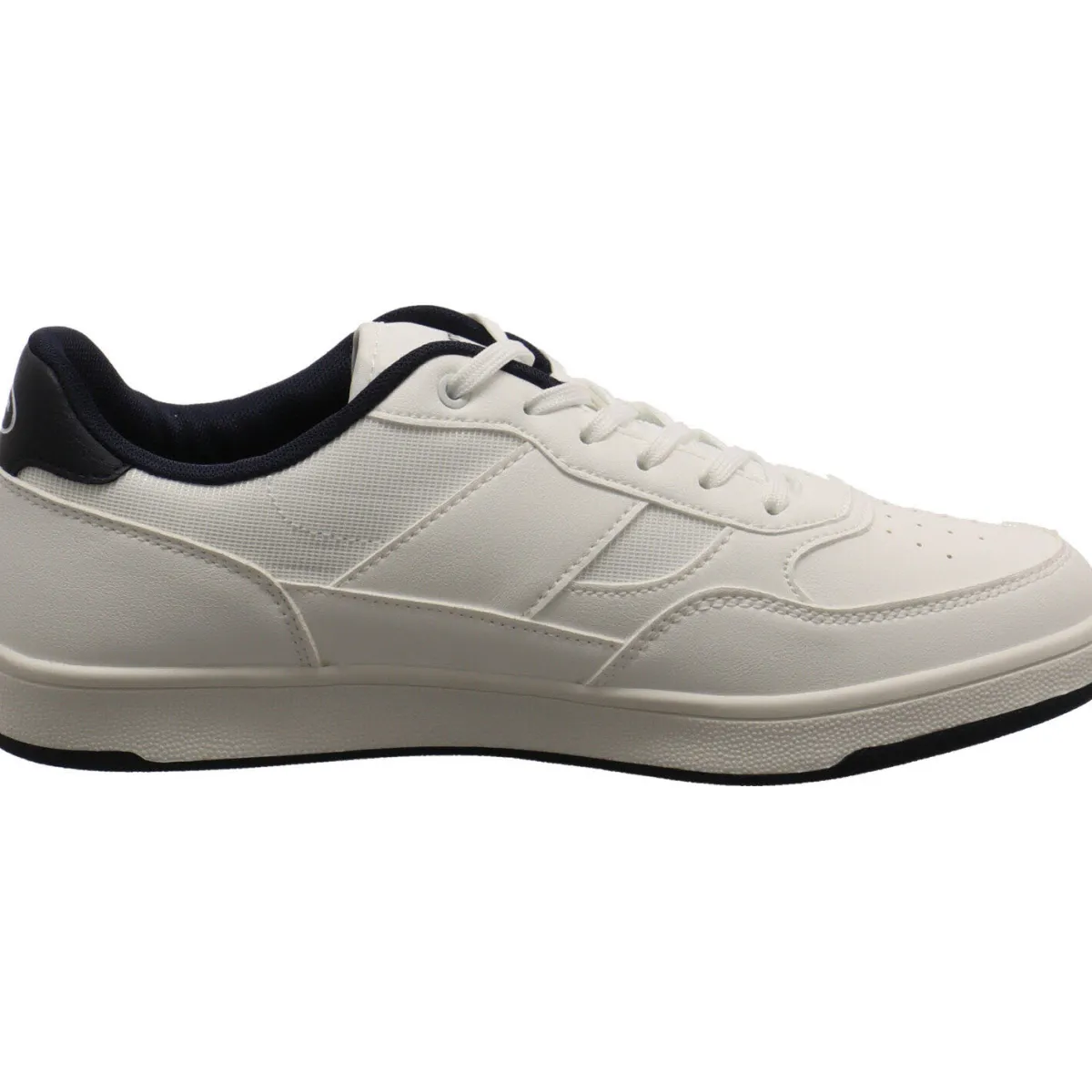 Das Obermaterial in Weiß, aus robustem Kunstleder mit Parts in Mesh Textil begeistert durch seine Prägung und die hellen Ziernähte.