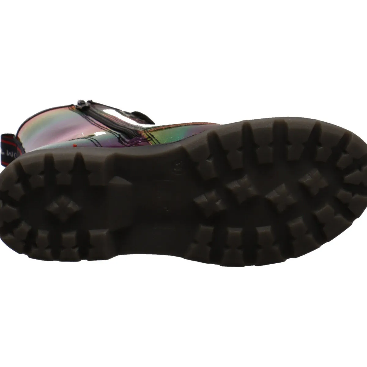 Gefertigt aus Kunstleder in Lack Optik in Bunt mit Glitzer begeistert er jedes Mädchen durch sein modisches Aussehen. Highlights sind die Schnürsenkel in Schwarz und das Textilband als Einstieghilfe mit Markenaufschrift an der Rückseite vom Schaft.