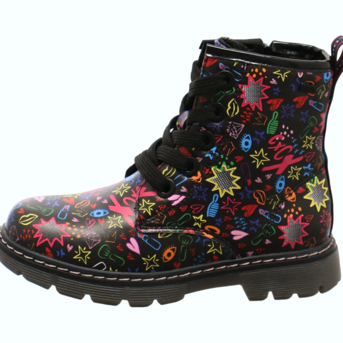 Gefertigt aus Kunstleder in Schwarz begeistert er jedes Mädchen durch seinen tollen Allover Print mit Herzen, Sternchen und vielem mehr. Weitere Highlights sind die Schnürsenkel in Schwarz und das Textilband als Einstieghilfe mit Markenaufschrift an der Rückseite vom Schaft.