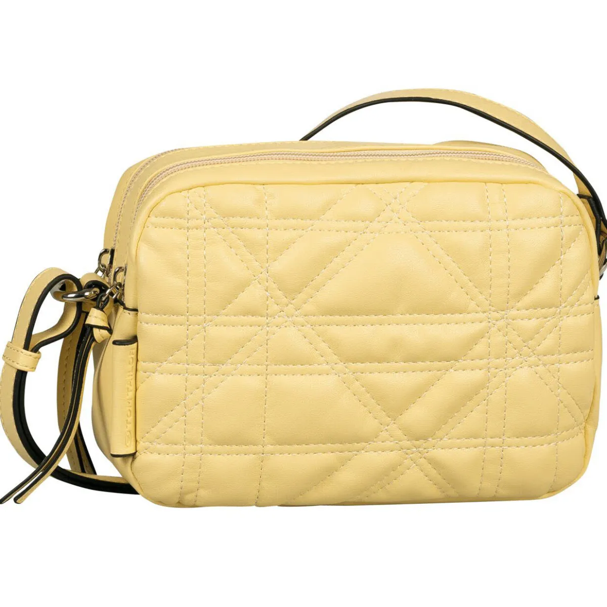 Das authentisch genarbte Kunstleder in Gelb ist auf der Rückseite mit geometrisch gesteppter Wattierung versehen. Zwei Hauptfächer werden mit Reißverschluss geschlossen und bieten Platz für alles, worauf du im Alltag nicht verzichten möchtest. Durch den praktischen, verstellbaren Umhängegurt kann die Tasche auch crossover getragen werden.