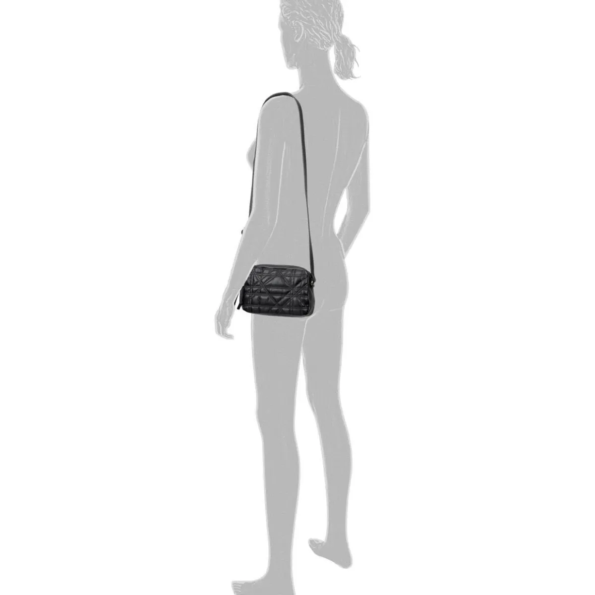 Das authentisch genarbte Kunstleder in Schwarz ist auf der Rückseite mit geometrisch gesteppter Wattierung versehen. Zwei Hauptfächer werden mit Reißverschluss geschlossen und bieten Platz für alles, worauf du im Alltag nicht verzichten möchtest. Durch den praktischen, verstellbaren Umhängegurt kann die Tasche auch crossover getragen werden.