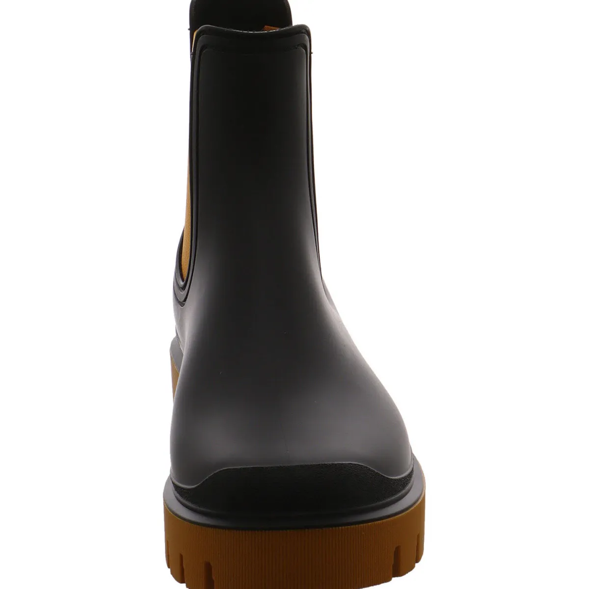 Gefertigt aus Synthetik in Schwarz ist er an den Seiten mit Gummipannels in Ocker Gelb versehen, diese passen perfekt zur groben Laufsohle und geben den Chelsea Boots ihren modischen Touch. Das Markenlogo auf dem Blockabsatz in Schwarz, ist ein weiteres Highlight. Das Innenfutter aus Textil sorgt für ein angenehmes Tragen.