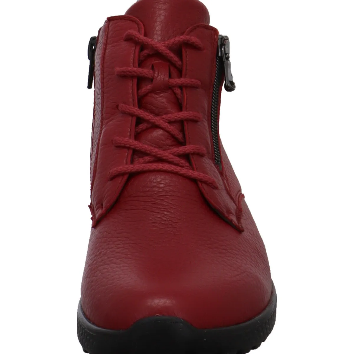 Das Obermaterial wurde aus weichem echtem Hirschleder in Rubin Rot gefertigt. Durch den Reißverschluss an der Innenseite und dem Reißverschluss neben der Schnürung ist der Einstieg besonders einfach. Mit der Schnürung kann der Schuh optimal an den Fuß angepasst werden.