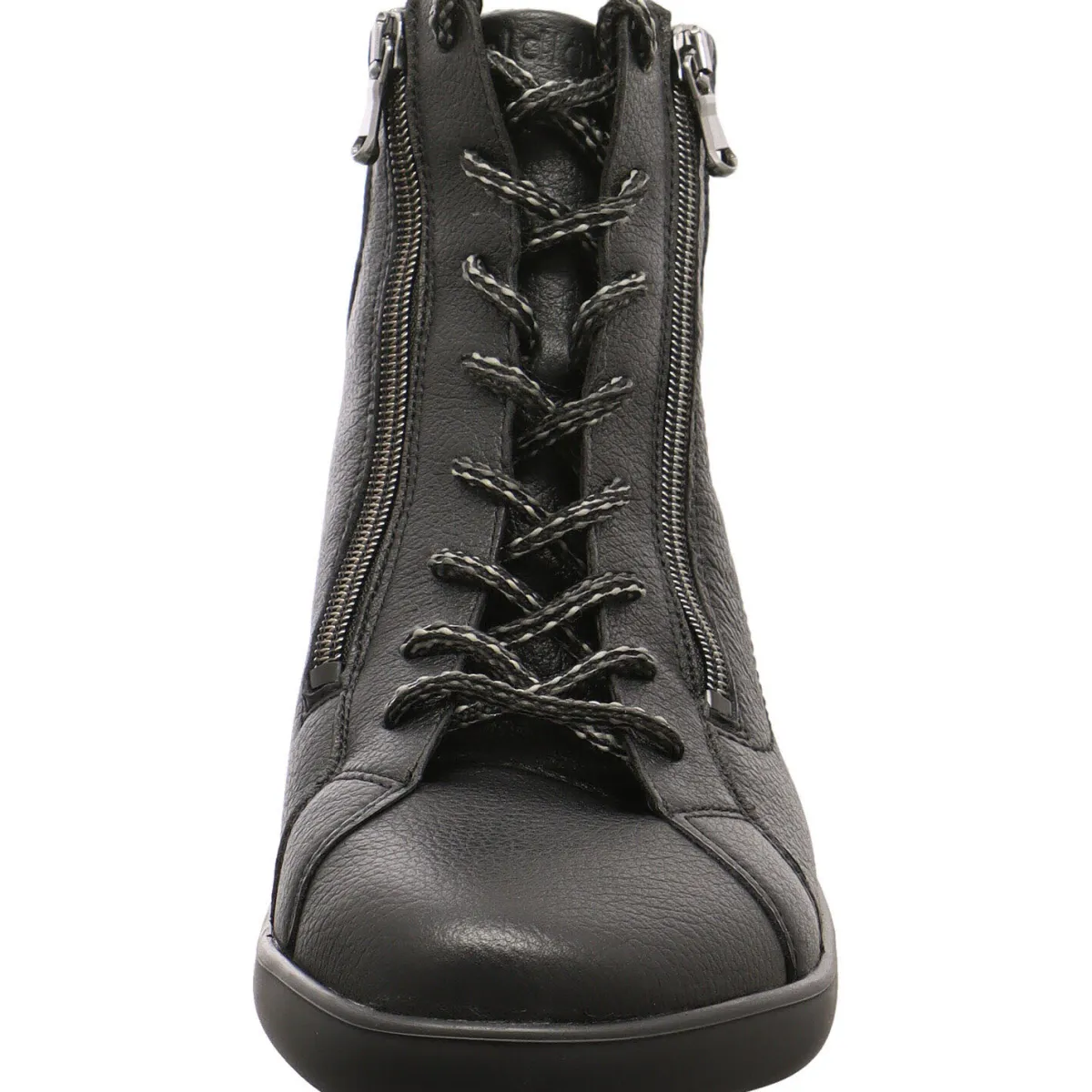 Das Obermaterial wurde aus weichem Echtleder in Schwarz gefertigt. Durch den doppelten Reißverschluss ist der Einstieg besonders einfach. Mit der Schnürung, kann der Schuh optimal an den Fuß angepasst werden.