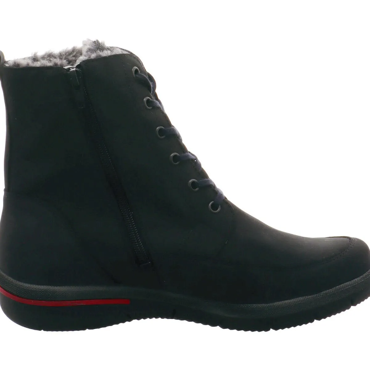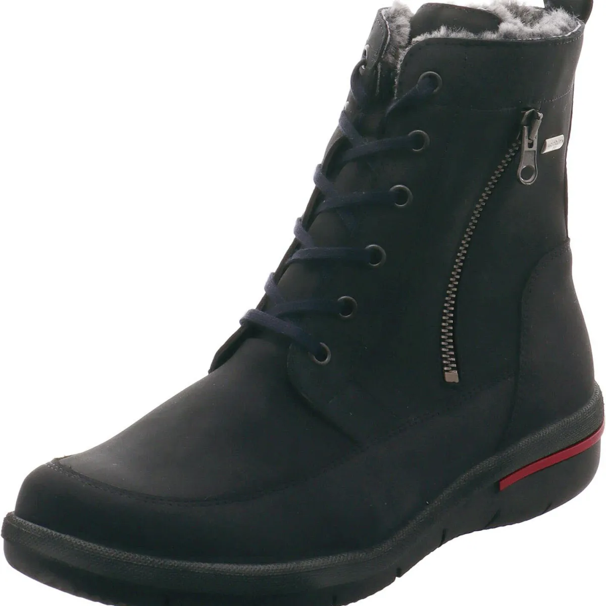 Der aus weichem und hochwertigem Nubukleder gefertigte Schuh bietet absoluten Komfort beim Gehen durch das gepolsterte Wechselfußbett und die Schuhweite H. Die leicht profilierte Laufsohle sorgt für guten Grip und die Schnürung in Komination mit dem seitlichen Reißverschluss garantieren einen leichten Einstieg. Der seitliche Zierreißverschluss und das Detail an der Ferse in Rot, runden das sonst schlichte Design gekonnt ab. Die integrierte Waldläufer Tex Membran macht den Schuh ausgesprochen wasserabweisend und atmungsaktiv.