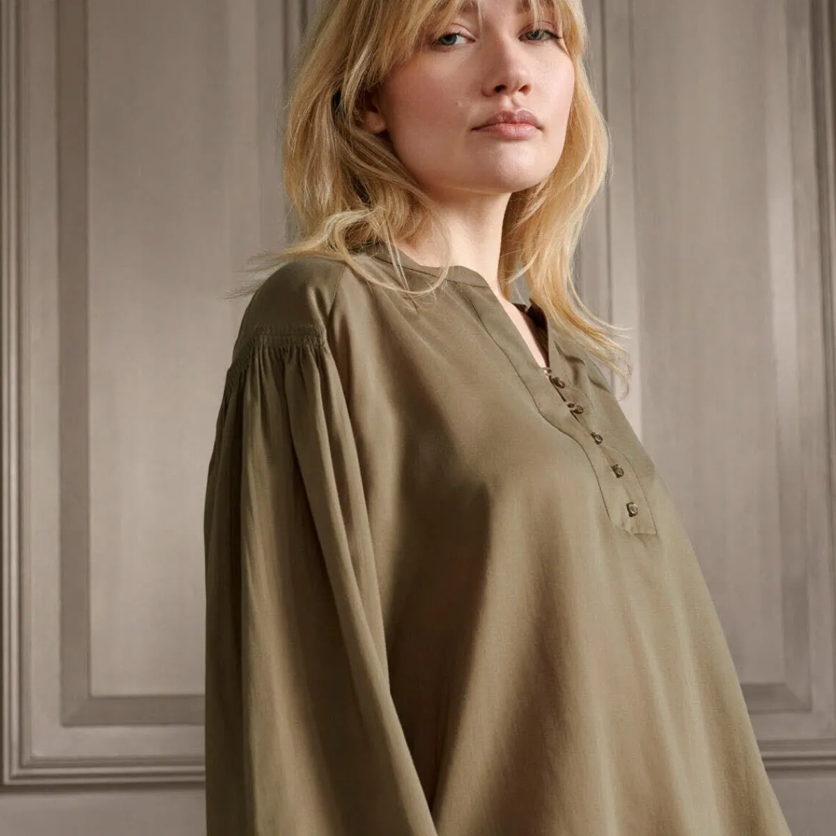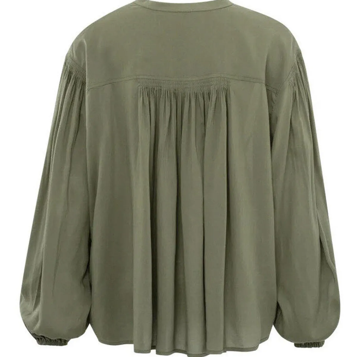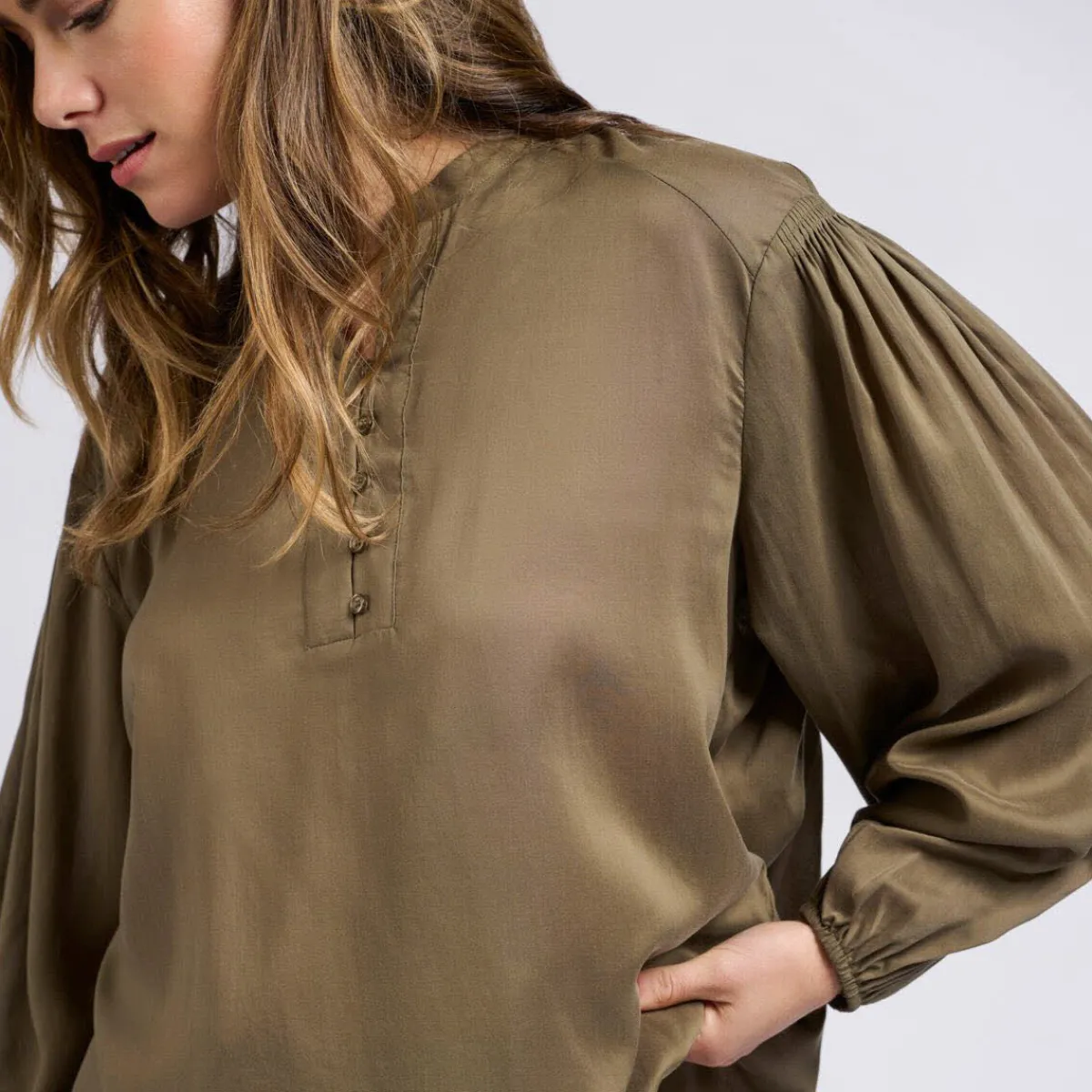 Das fließende Gewebe in Olive Grün, begeistert mit tollen Details. Wie dem V-Ausschnitt mit Knöpfen, den weiten langen Ärmeln und den Plisseedetails an Ärmeln und Rücken.