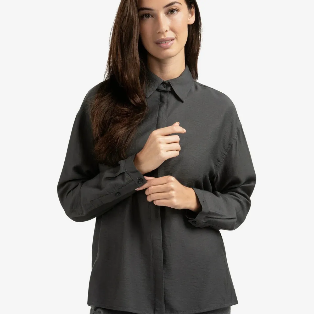Diese ist jedoch mit zwei besonderen Funktionen ausgestattet. So kannst du den klassischen Kragen abnehmen und erhälst einen kleinen Stehkragen und auch die Manschetten der langen Ärmel lassen sich abnehmen. So veränderst du die Bluse komplett in ihrer Optik entsprechend dem Anlass. Sie verfügt außerdem über eine verdeckte Knopfleiste und ist am Rücken mit einer Pliseefalte gearbeitet. In Verbindung mit der lockeren Passform, hast du einen tollen Tragekomfort.