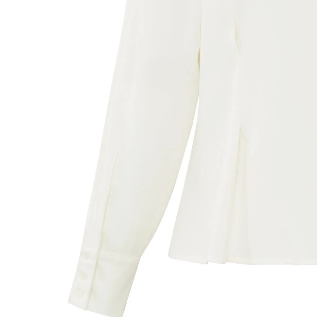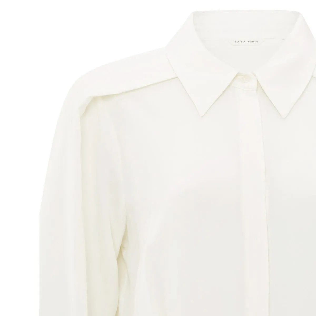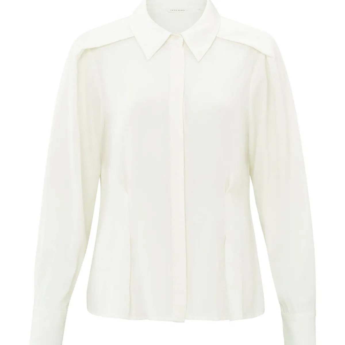 Sie verfügt über einen klassischen Kragen und eine verdeckte Knopfleiste. Als Hingucker ist sie mit Schulterdetails gearbeitet, dazu hat die Bluse einen taillierten Schnitt und lange Ärmel mit Manschetten.