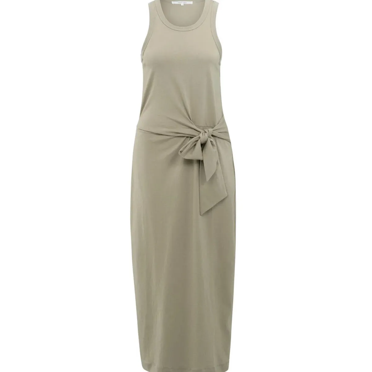 Es wurde aus reiner Baumwolle in Beige gefertigt. Es hat einen Rundhalsausschnitt und eine enge Passform. Auch hier findest du ein Knotendetail an der Taille. Es ist Ärmellos und hat die angesagte Midi Länge.