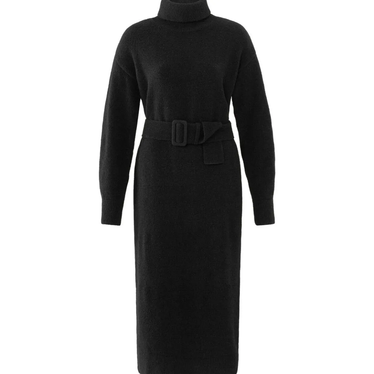 Das Strickgewebe in Schwarz ist mit einem bequemen Rollkragen und langen Ärmel ausgestattet. Das Kleid hat eine legere Passform und wird durch den farblich abgestimmten Taillengürtel toll in Szene gesetzt.