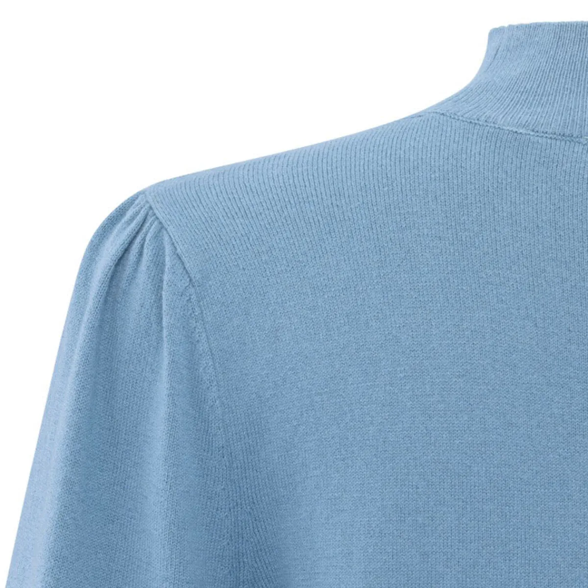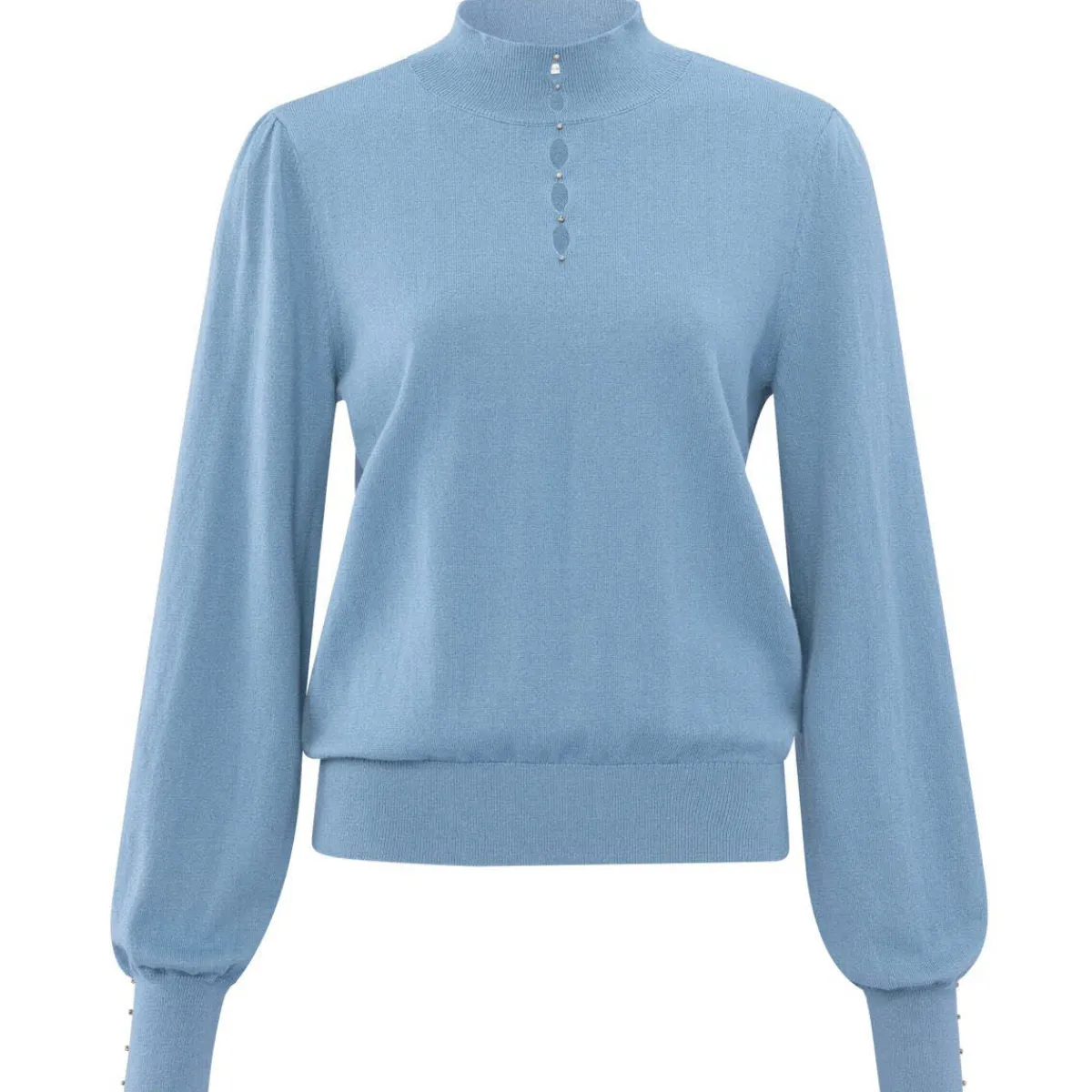 Das weiche Strickgewebe in Blau ist auf der Vorderseite mit kleinen Knöpfen und Cutouts verziert. Diese kommen durch den kleinen Stehkragen besonders gut zur Geltung. Er hat lange Ballonärmel mit Rippstrick Bündchen an denen die Knöpfe ebenfalls zu finden sind. Er hat einen normalen Schnitt, und verleiht jedem Outfit das gewisse Etwas.