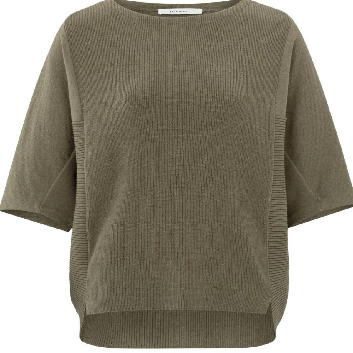 Sofort ins Auge fällt der schöne halblange Ärmel mit Feldermaus Schnitt. Der Rundhalsausschnitt passt super dazu und als besonderer Hingucker ist er mit einem individuellen Rippstrickmuster verziert.