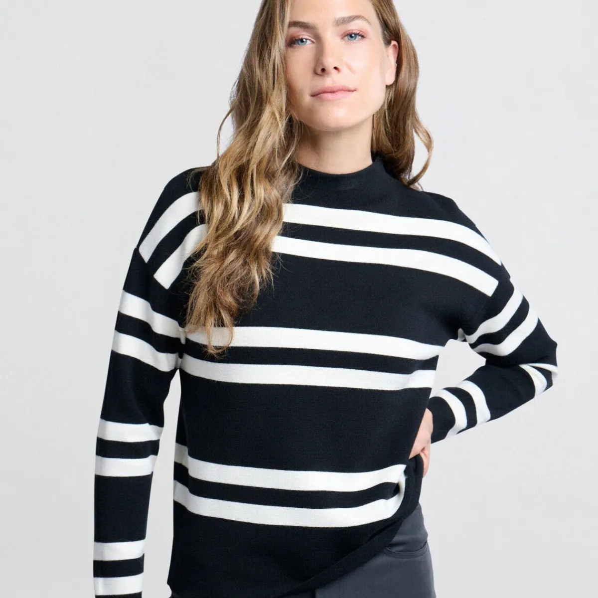 Das Strickgewebe in Schwarz mit Weiß, wurde als Blockstreifen gearbeitet. Er hat einen kleinen Stehkragen. lange Ärmel und eine lockere Passform und ist daher für gemühtliche Winter Tage super geeignet. Kombiniere ihn lässig mit einer Jeans und tollen Boots für den Winter.