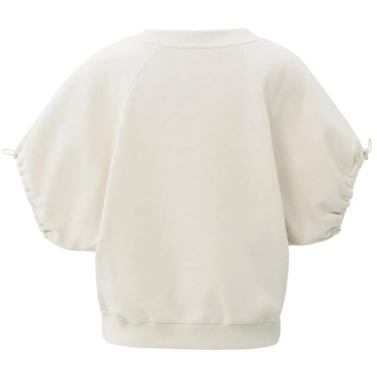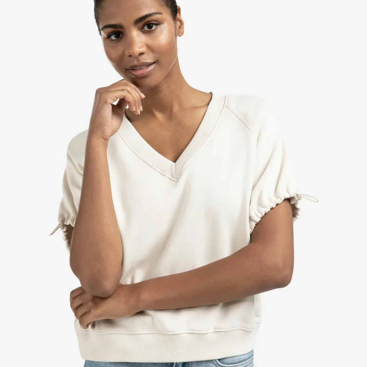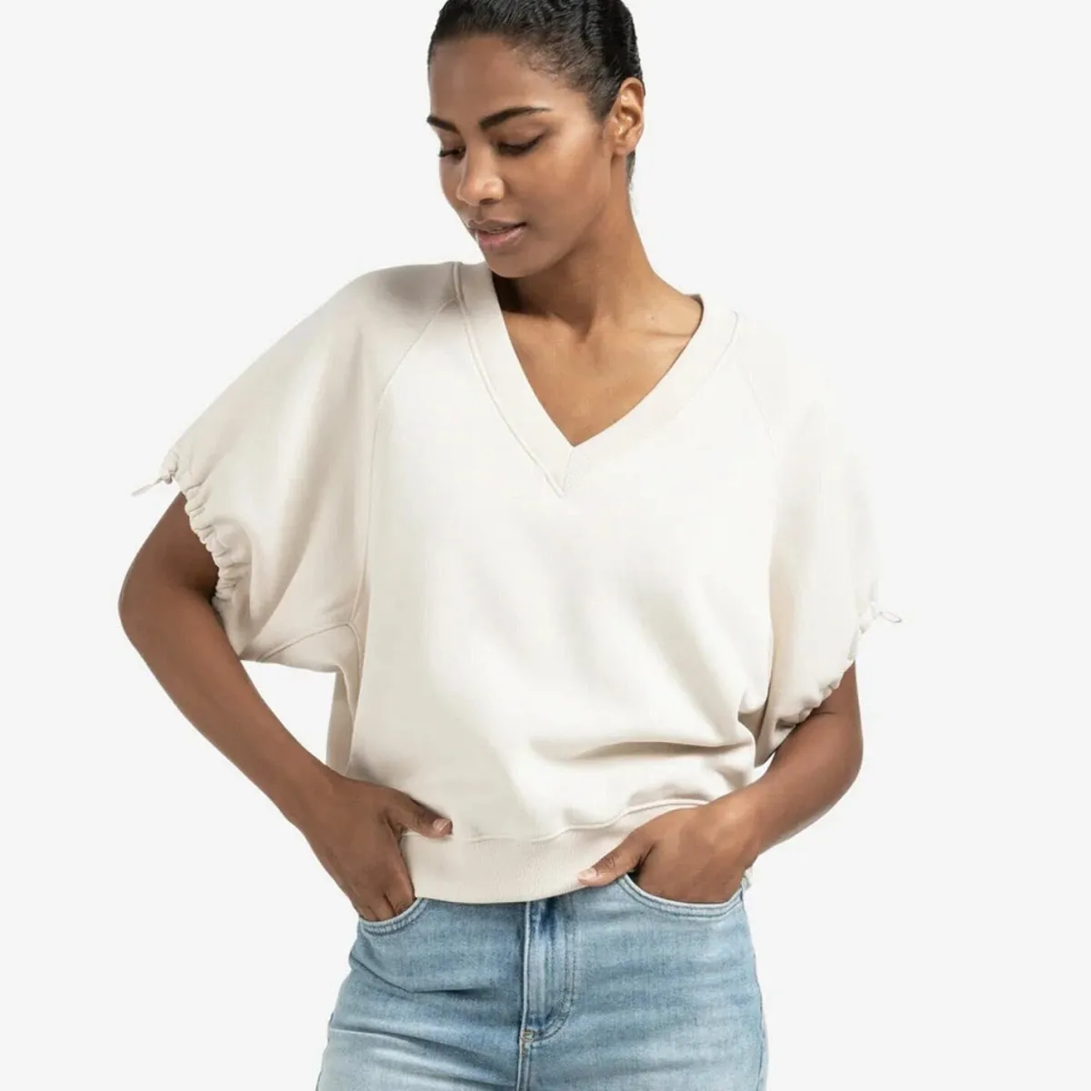 Das Mischgewebe in Beige ist mit einer Oversize Passform gearbeitet. Es hat einen V-Ausschnitt und als Eyecatcher kurze, weite Ärmel, welche mit einem Kordelzug gearbeitet sind. So kannst du ihre Form und Länge nach deinen Vorstellungen einstellen.