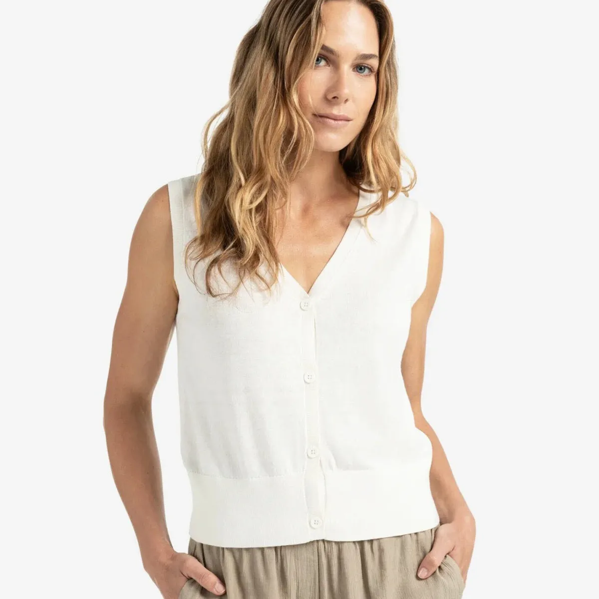 Das Feinstrick Gewebe in Weiß ist mit einem V-Ausschnitt und einer durchgehenden Knopfleiste gearbeitet.